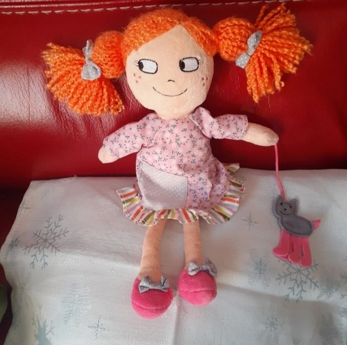 Poupée-chiffon rousse avec son chat; entièrement rembourrée; visage brodé; cheveux en laine synthétique; robe en tissu; chat en feutrine; cousu à la main de la poupée // voir photos pour détails