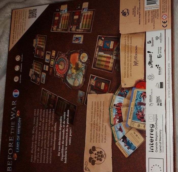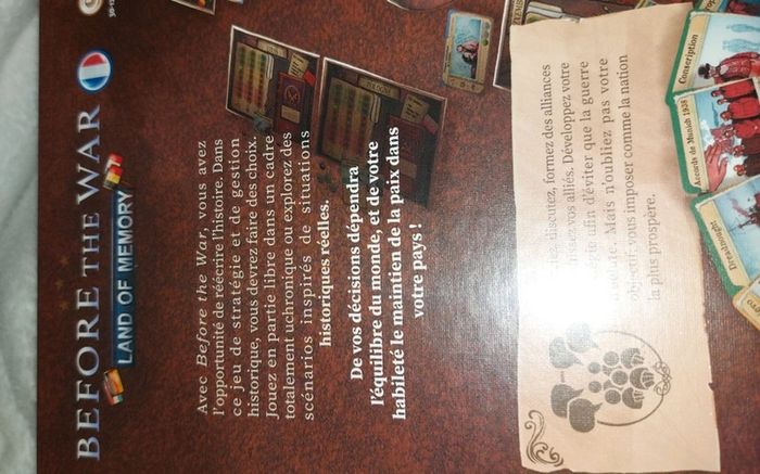 Découvrez "Before the War", le jeu de société captivant de Land of Memory. L'occasion parfaite pour transmettre la mémoire et faire découvrir l'histoire de notre territoire. Un outil original pour les musées, professeurs, ludothèques... afin de présenter les événements marquants du XXème siècle de façon ludique, inédite et immersive. Jeux neuf sous blister Parfait pour les fans de jeux thématiques Les joueurs sont chacun à la tête d’un pays européen et doivent faire des choix et des alliances: l’équilibre du monde en dépend. Ce jeu de stratégie et de gestion historique permet une meilleure compréhension des enjeux et mécanismes liés aux guerres. Les scénarios sont inspirés de situations historiques réelles. Envois rapide