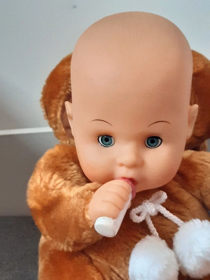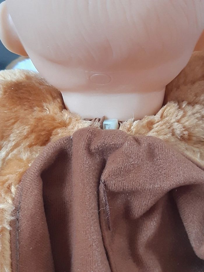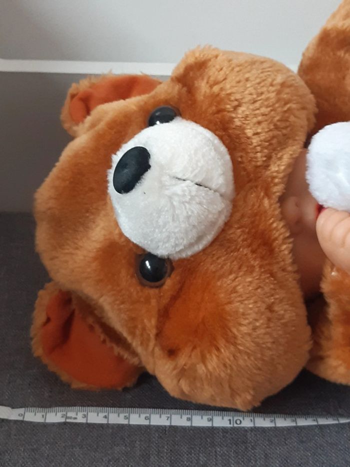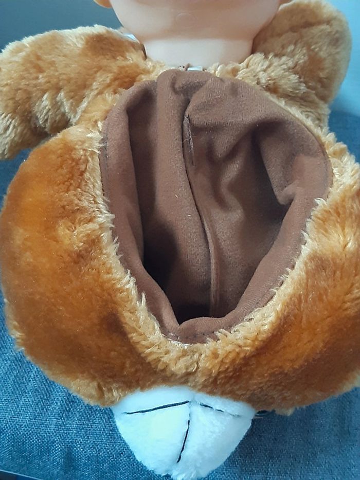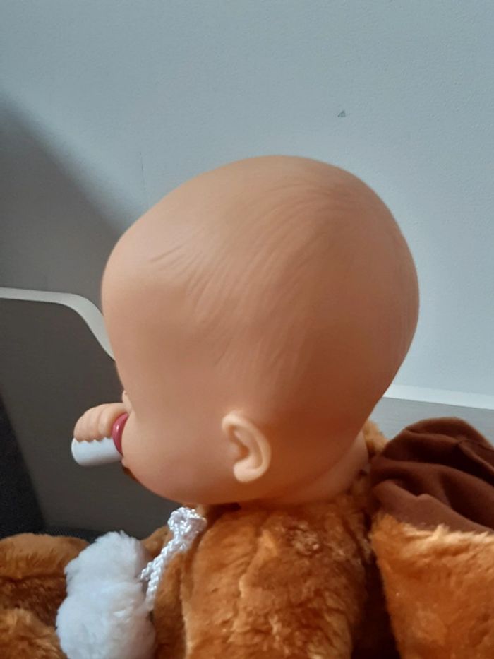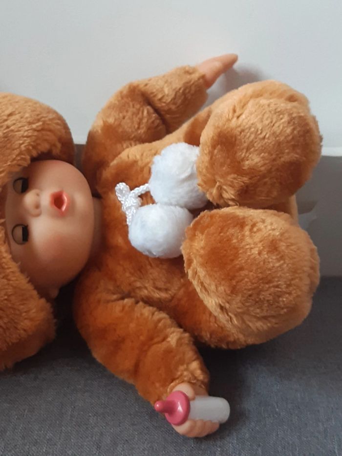 Poupon / Bébé Peluche Deguisement ours 🐻 Yeux dormeurs A un biberon dans l'une de ses mains Capuche sûrement recousu D'autres photos possible sur demande Merci de privilégier les envois par Mondial Relay