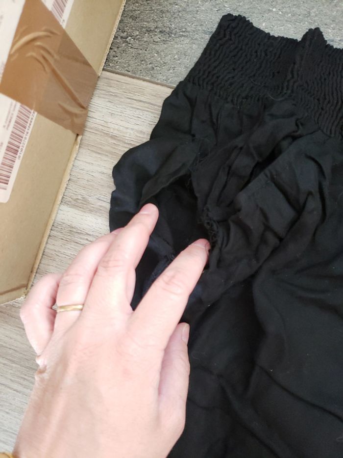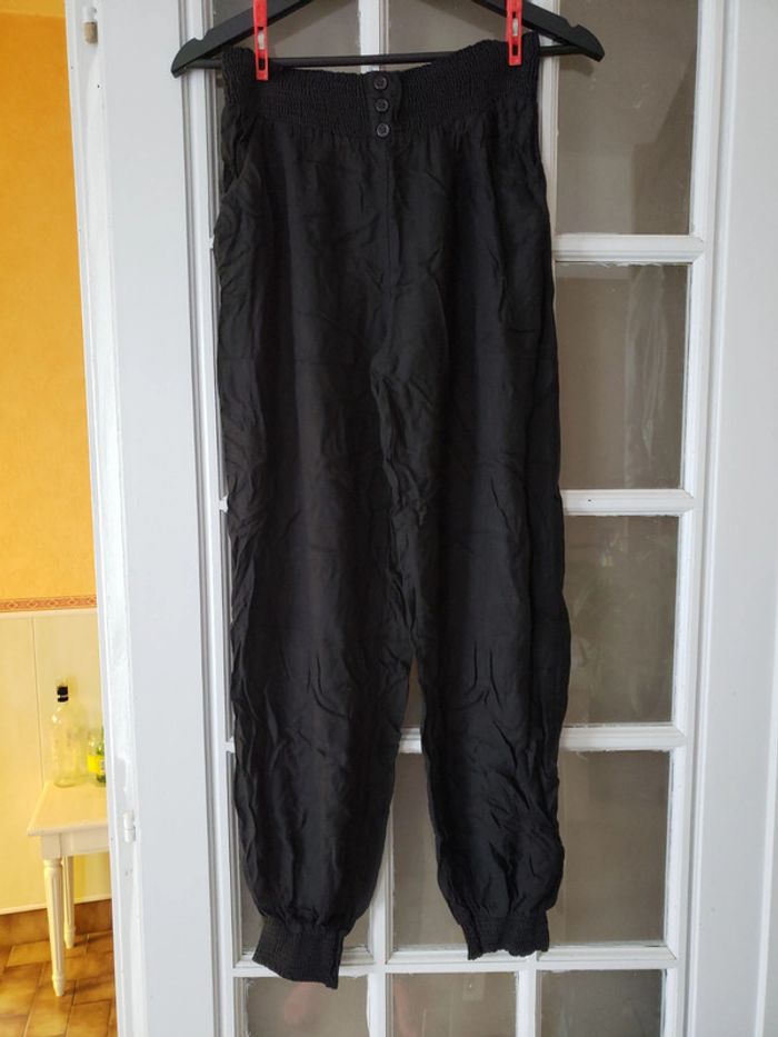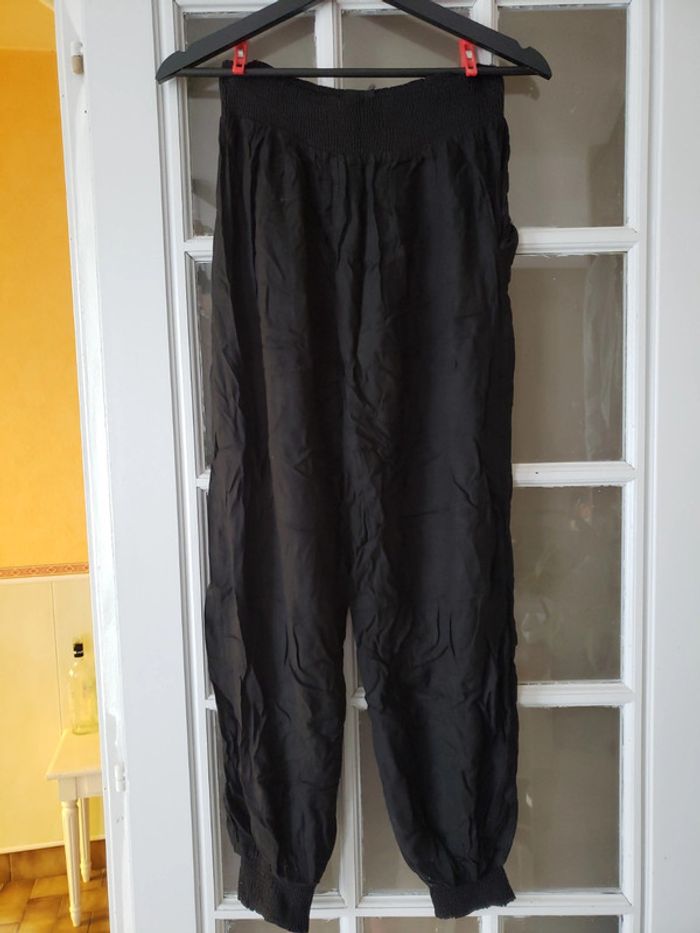 Pantalon noir léger serrant aux chevilles en bonne état. Il y a seulement un trou au niveau d'une des poches (dsl je suis mauvaise couturière 😉) taille petit. Vêtement lavé avant envoie