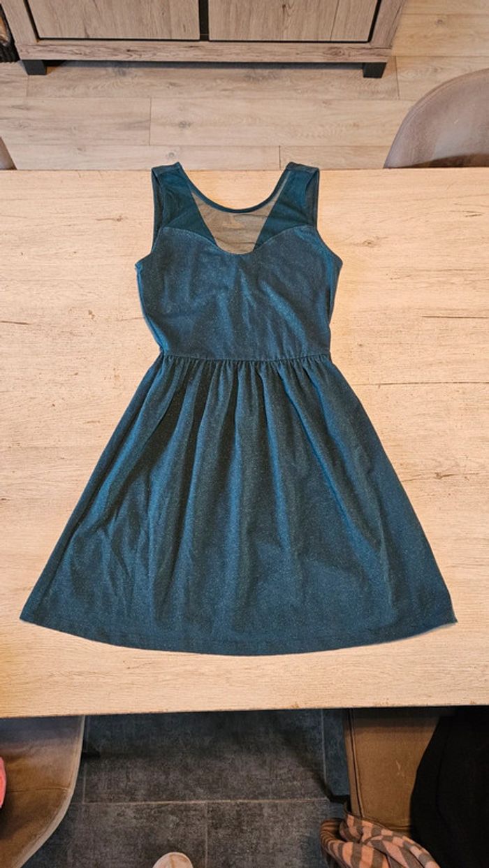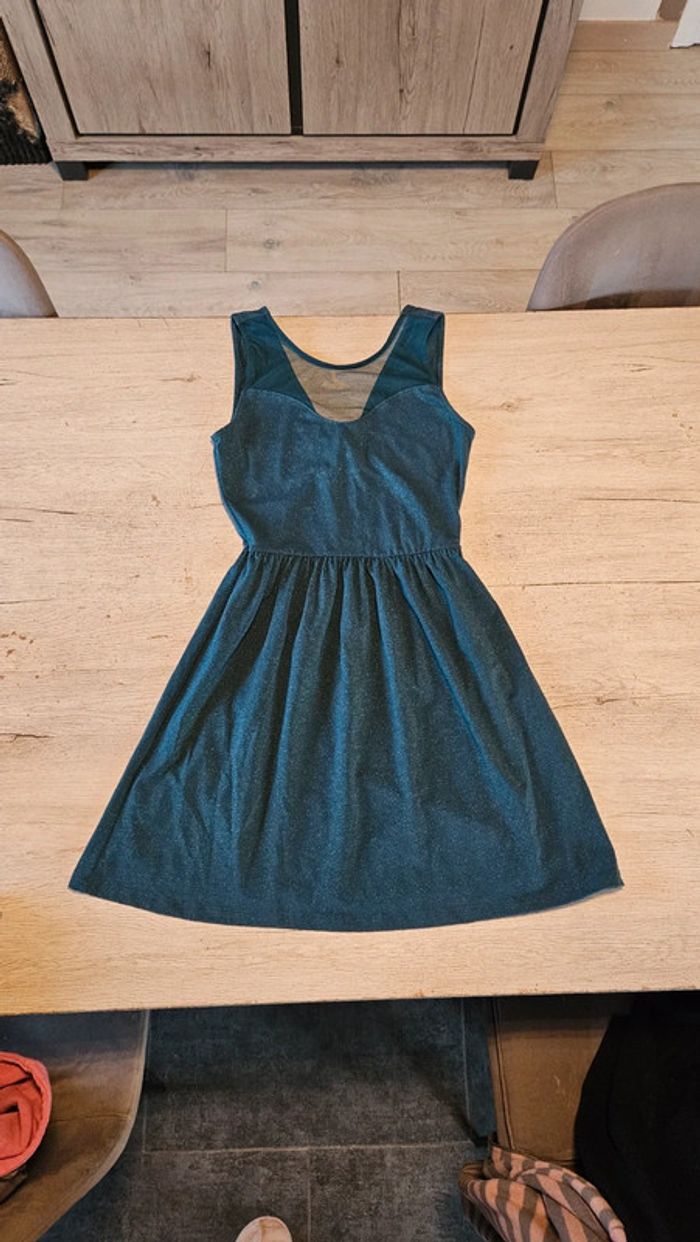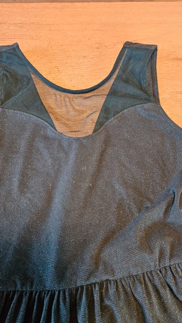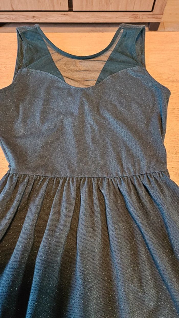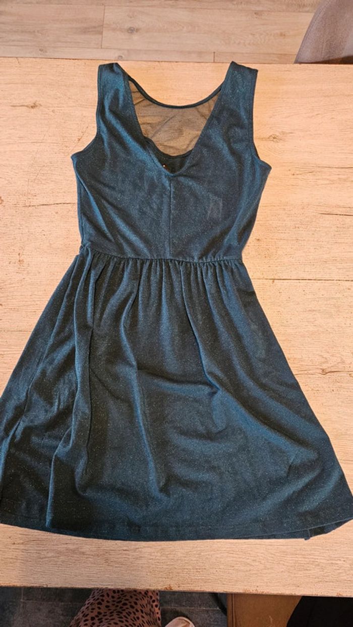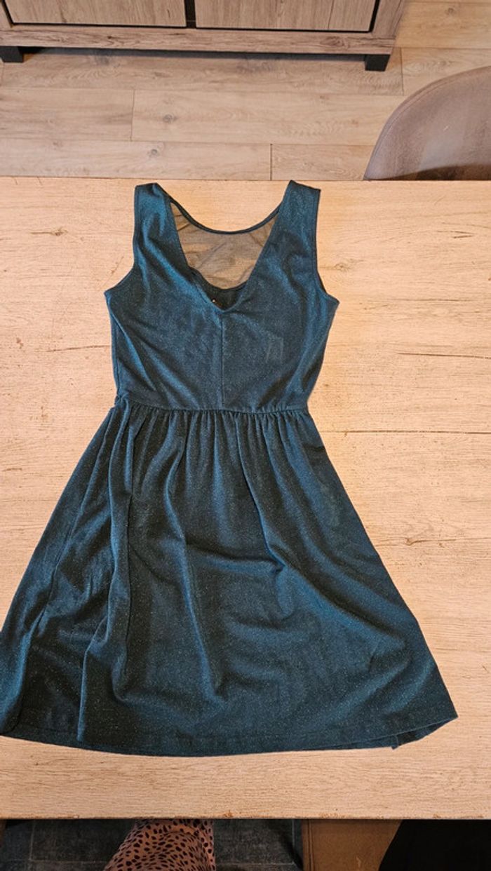 Jolie robe courte ideal pour les fêtes. Elle est verte très très foncé avec des brillants discrets. A bretelle avec un voile vert transparent au dessus de la poitrine. Ceintrée. Elle est élastique. Ma fille ne l a jamais mise mais juste essayée et lavée Convient pour du 38 à 40 #deborahtock_femmeM #deborahtock_femmeL #deborahtock_fêtes