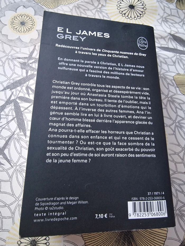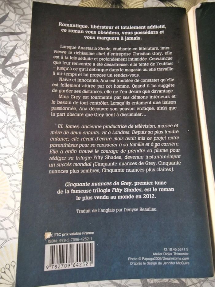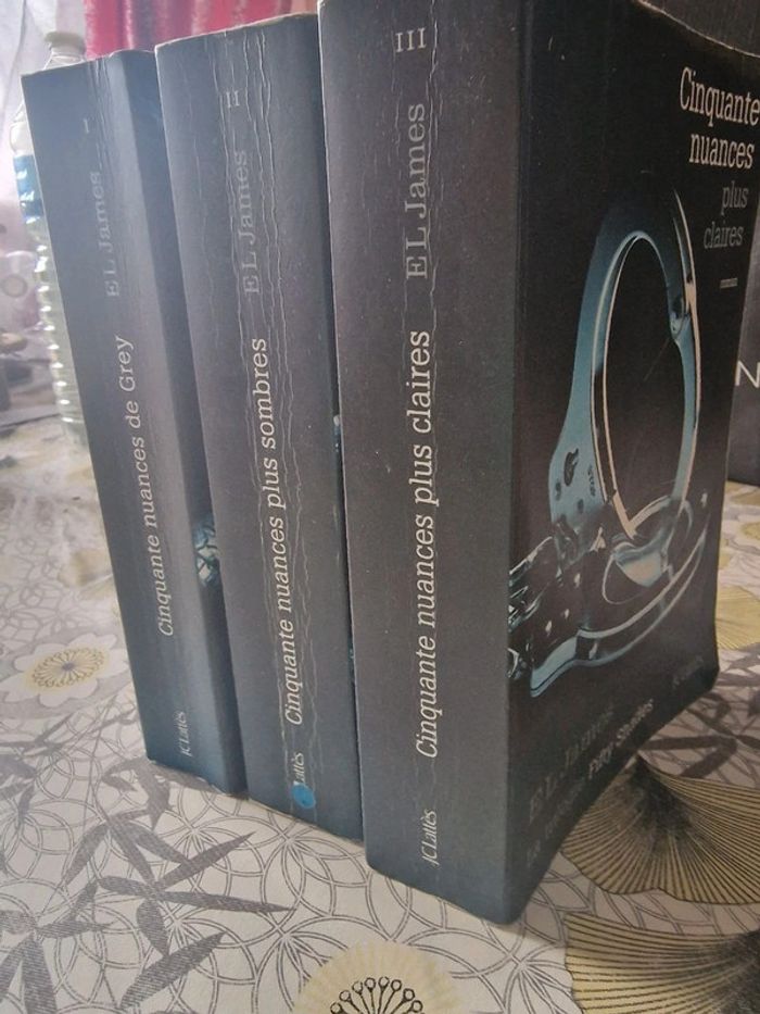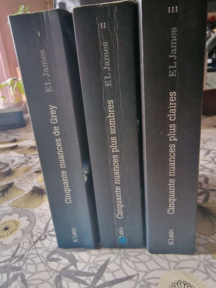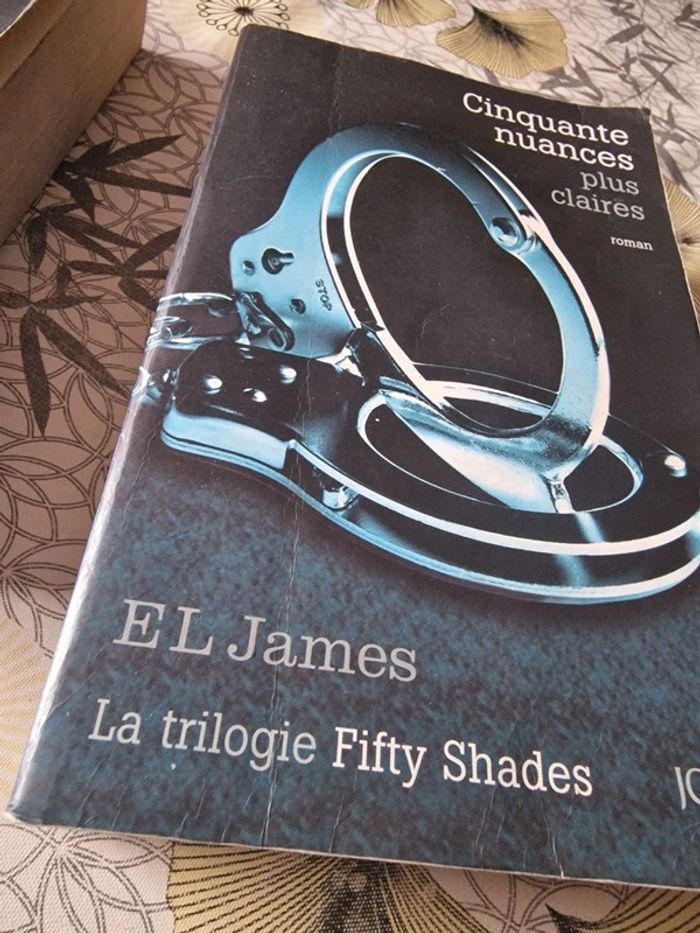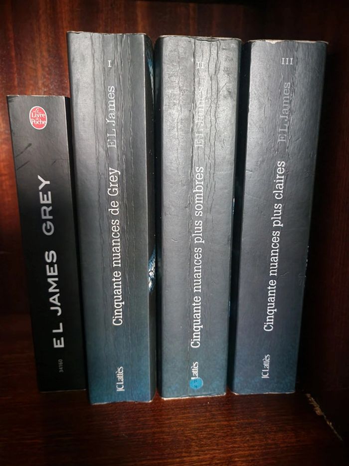 Quadrilogie de EL James 50 nuances de Grey format broché (bon état) 50 nuances plus sombre format broché (bon état) 50 nuances plus claires format broché (bon etat) Grey format poche (très bon etat) En bon état général malgré quelques coins un peu abîmés, couvertures et pages un peu jaunies pour certains. (voir détails en photos) Les pages ont un peu changé de couleurs mais n'impacte pas la lecture.