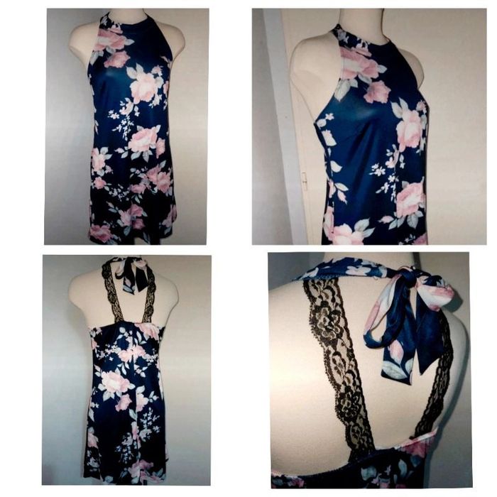Magnifique robe bleue fleurie , taille M . Manches en dentelle dos . Très jolie .