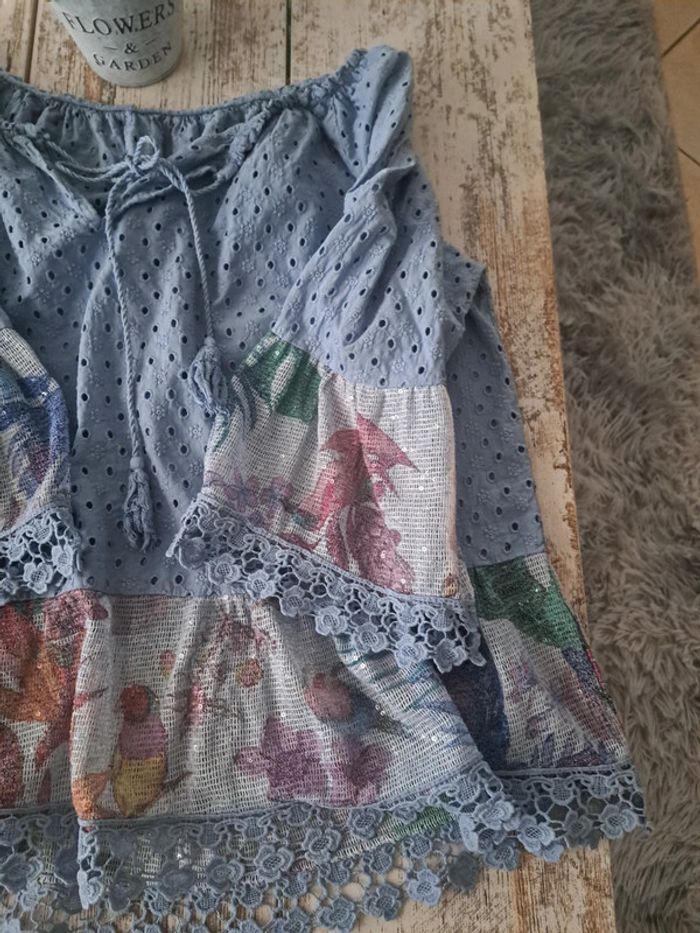 Haut bleu dentelle broderie et sequins - photo numéro 1