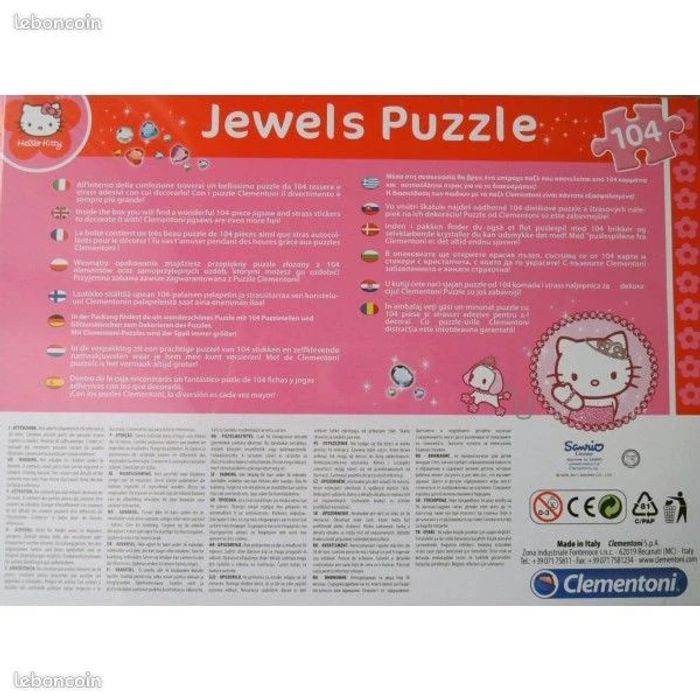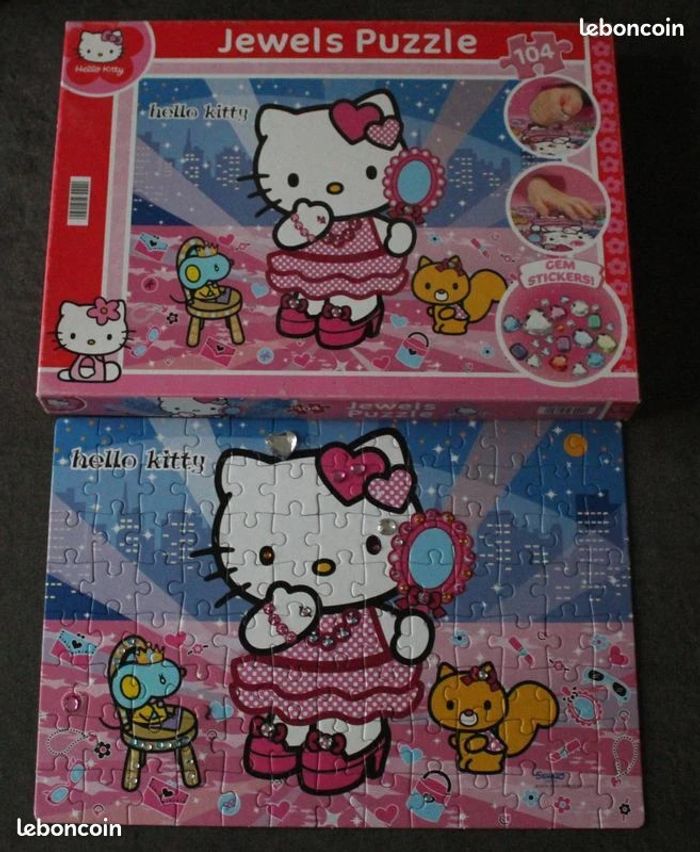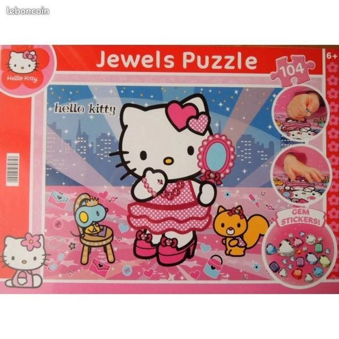 puzzle hello kitty 104 pieces jewels La boite contient un très beau puzzle de 104 pièces ainsi que 55 strass autocollants qui le décorent. puzzle excellent état et complet