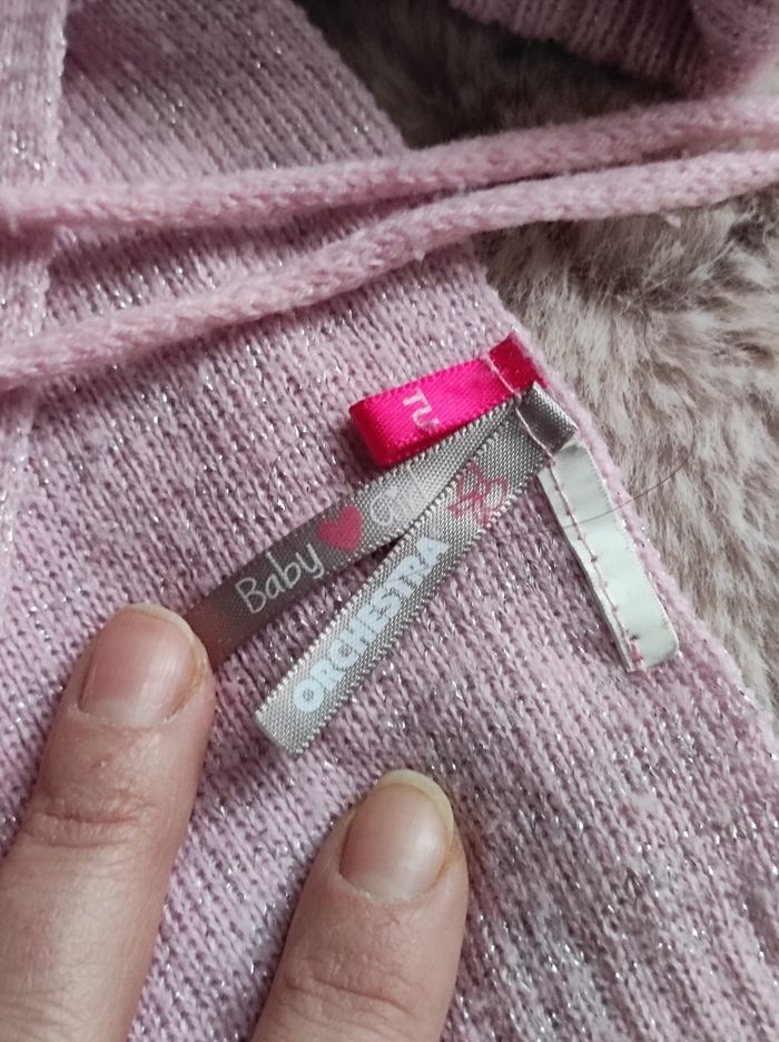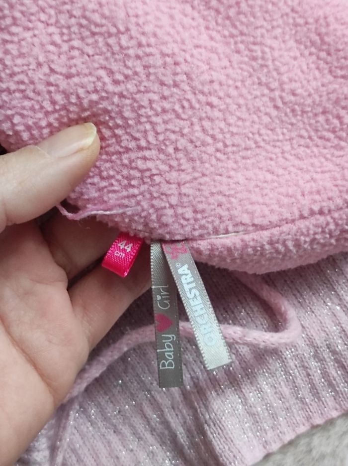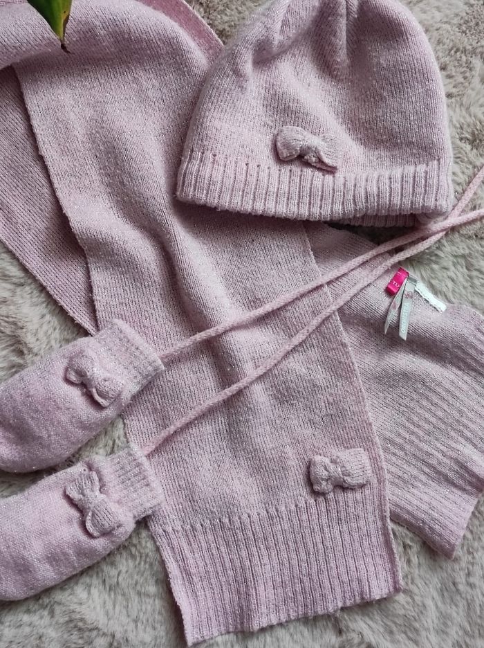 lot d'hiver pour se tenir au chaud de la marque orchestra dont un bonnet en taille 44cm, une écharpe et des gants doublé en taille 1, de couleur rose, très peu servie mais reste en bon état.