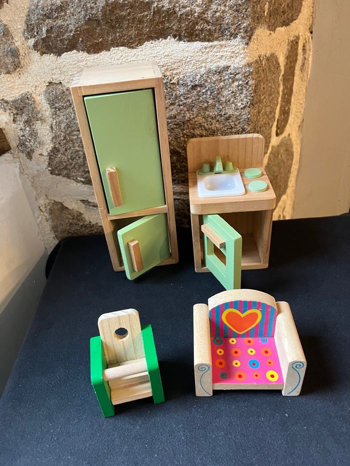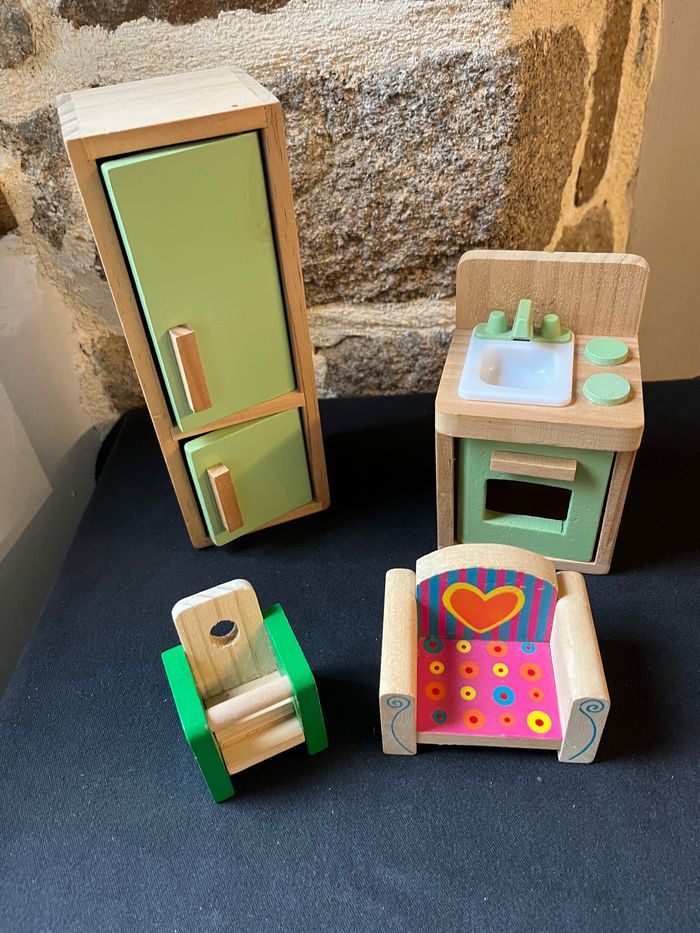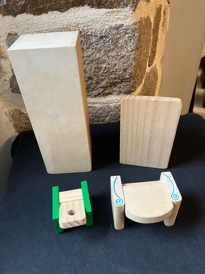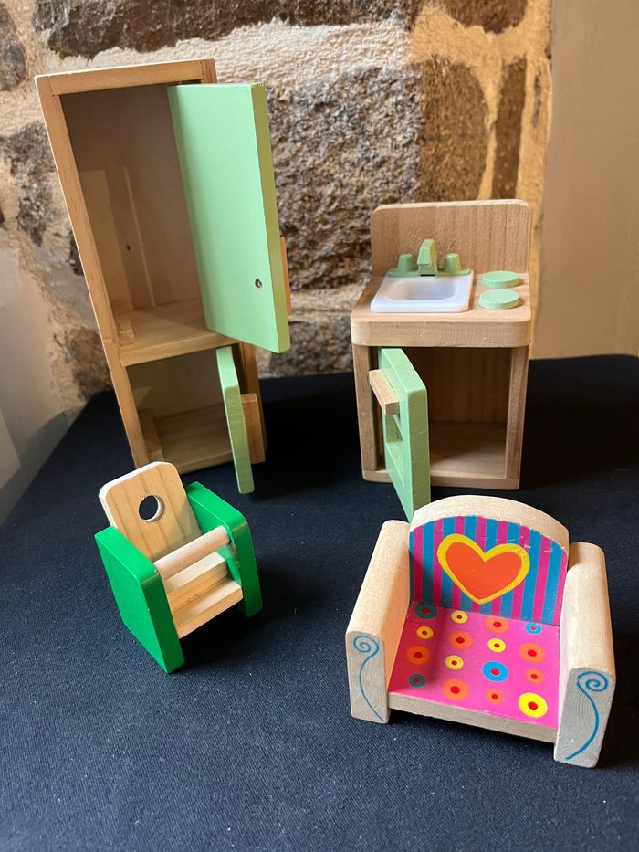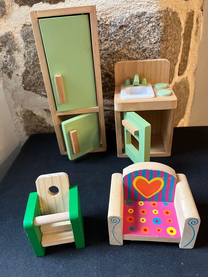 Voici un lot de meubles miniatures pour maison de poupée que je mets en vente. Il s'agit d'un ensemble de pièces en bois et en plastique de différentes couleurs, comprenant un meuble de rangement vert, une table et deux chaises. Ces éléments sont parfaits pour meubler une maison de poupée et permettre à votre enfant de jouer à la décoration intérieure. Ils sont en très bon état