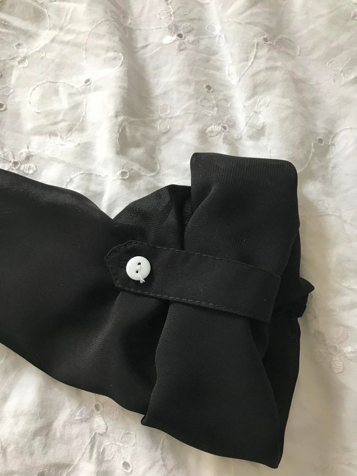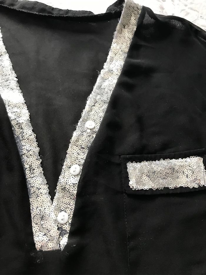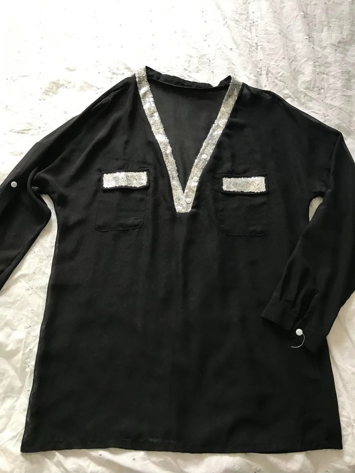 Haut festif tout neuf , jamais porté . Noir tout en transparence avec sequins argentés , manches retroussables, taille correspondant à un 40/42 . 8€