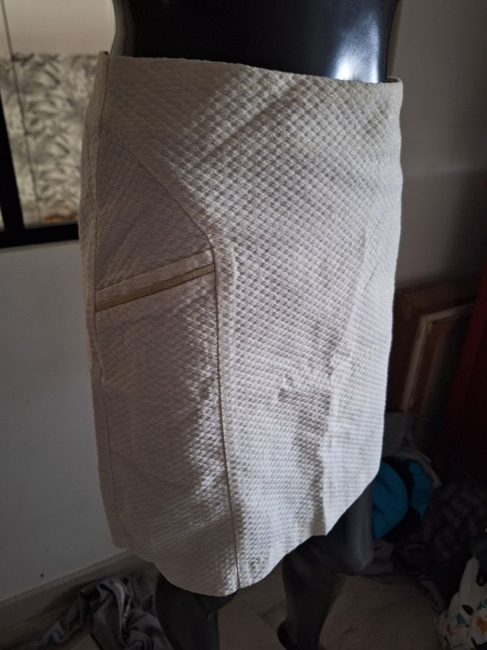 Jupe crème courte avec brillant couleur or Marque Camaïeu taille 34 fermeture à l'arrière Très bon état Beaucoup d'autres vêtements disponibles en différentes tailles n'hésitez pas à jeter un coup d'œil petits prix