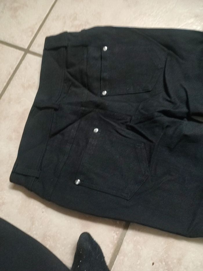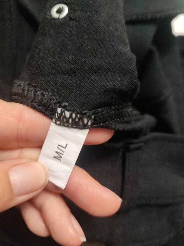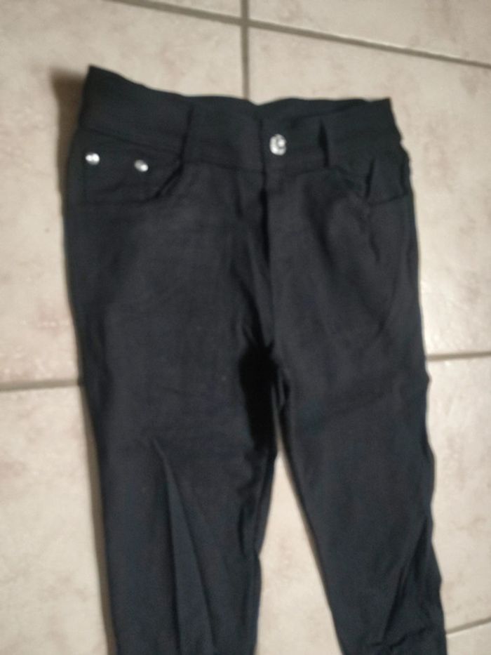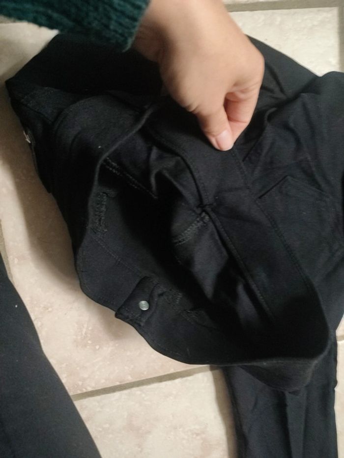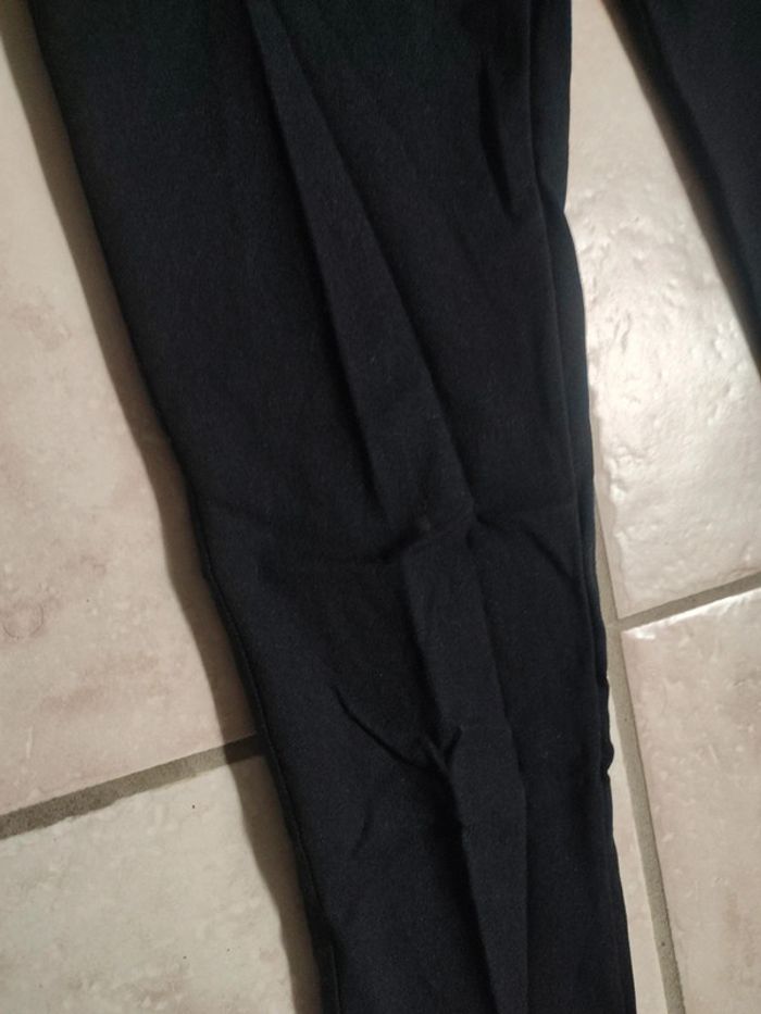 Très bon état porté une fois pantalon noir extensible avec élastique à la taille pas de bouton ni de fermeture éclair taille M/L Légère tâche au genou je ne sais pas si elle part au lavage