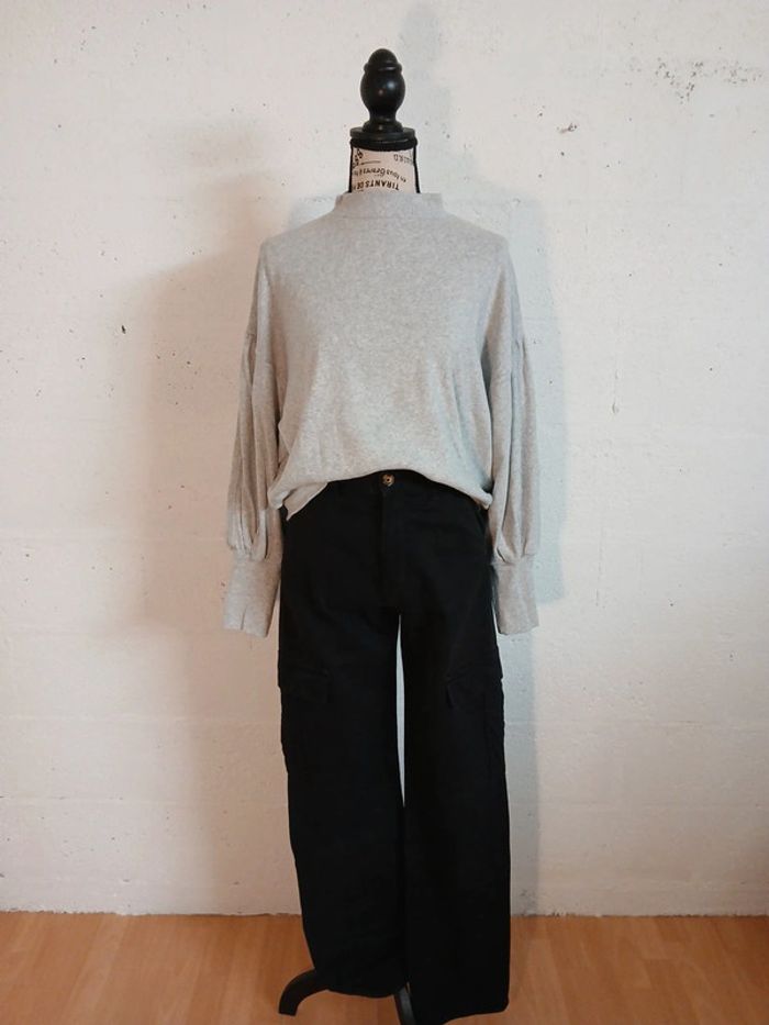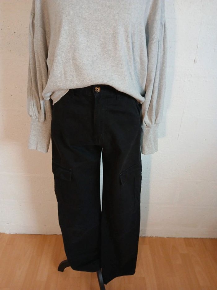 Pantalon noir Bon état Coupe cargo , jambes assez larges et poches sur les cotés Taille à plat 34 cm Longueur jambes 111cm Sweat gros pull& bear taille S à retrouver en vente séparément dans mon dressing Réduction activée sur les lots de 2 articles 😊