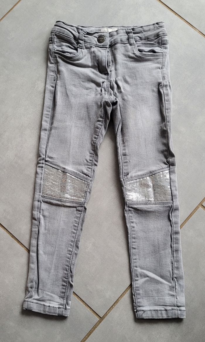 Jean gris clair, avec sequins au niveau des genoux, de la marque Orchestra, taille 5 ans (110 cm), en très bon état. Article lavé pour la vente. #5anslae72