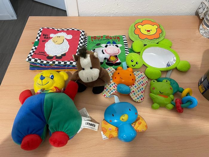 Lot de 7 petits jouets en bon état ( le 8eme le livre je donne en plus car tissu un peu passé mais n’empêche pas de jouer avec) hochet miroir nounours qui fait du bruit livres avec texture #jeuxjouetslivresmanon_cot
