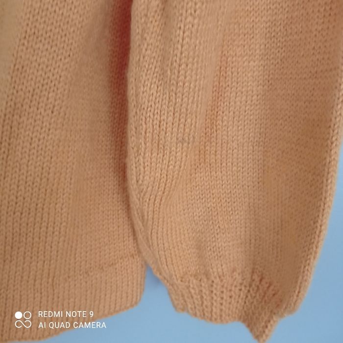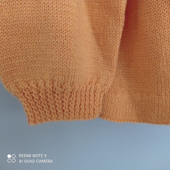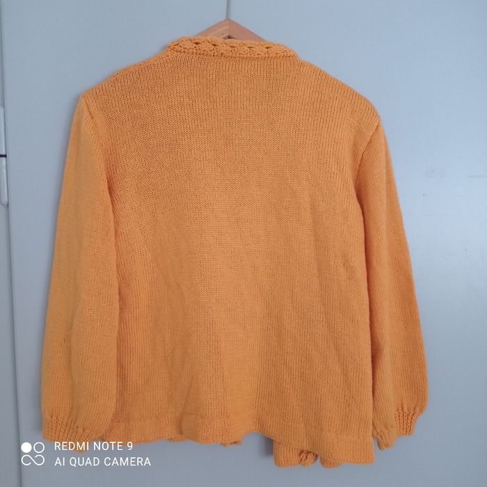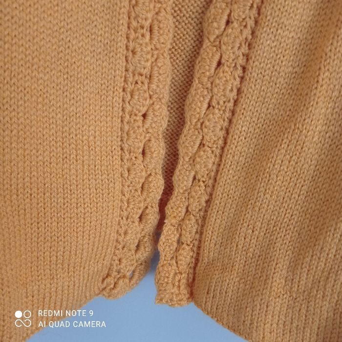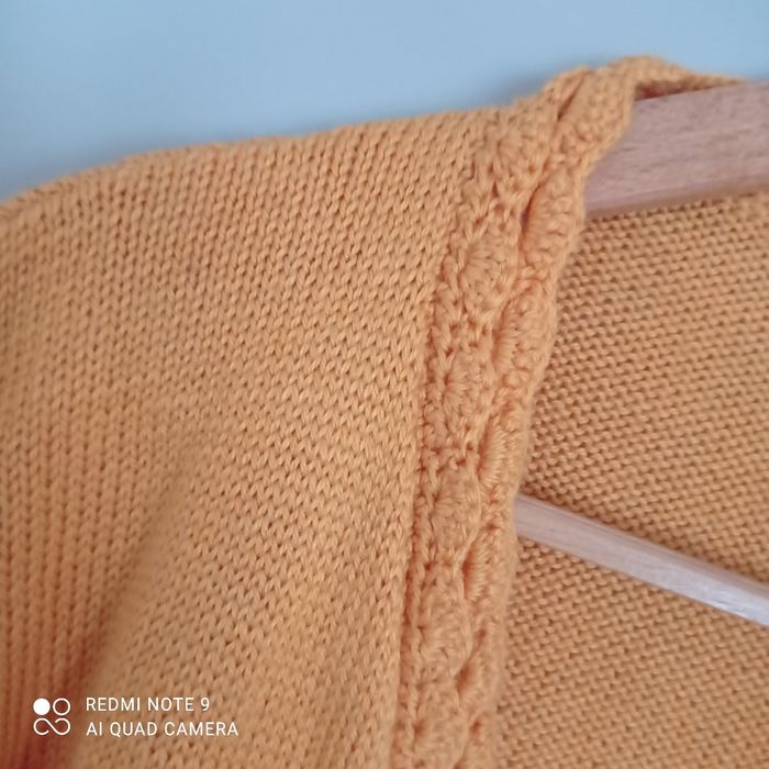 Fait main. Joli liseré torsadé. Ne ferme pas. Pas de boutons. Je ne connais pas la composition. Ne gratte pas. Taille estimée. Voici les mesures prises à plat : épaules : 42cm, aisselles : 49cm, longueur : 61cm.