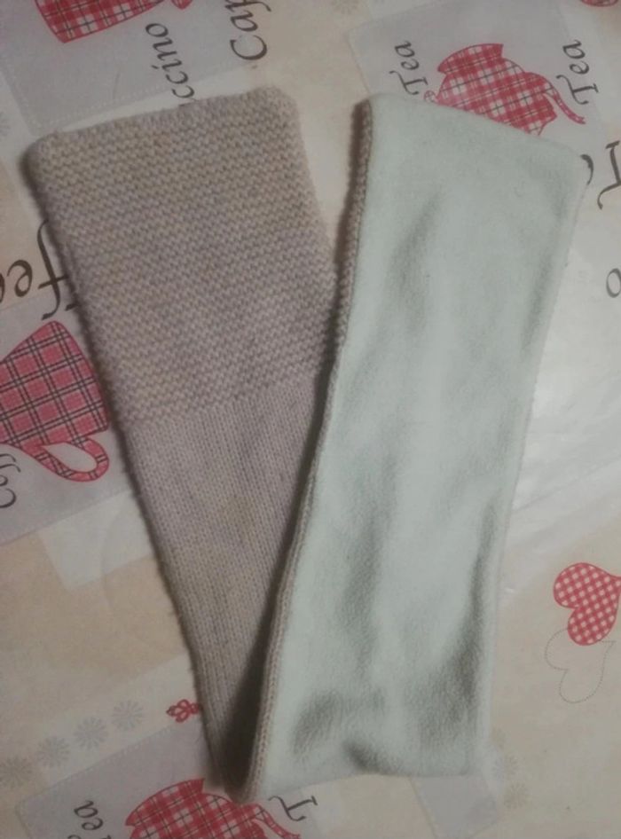 Écharpe avec 2 faces = 1 crème toute douce et 1 beige style lainage. Longueur 80 cm.