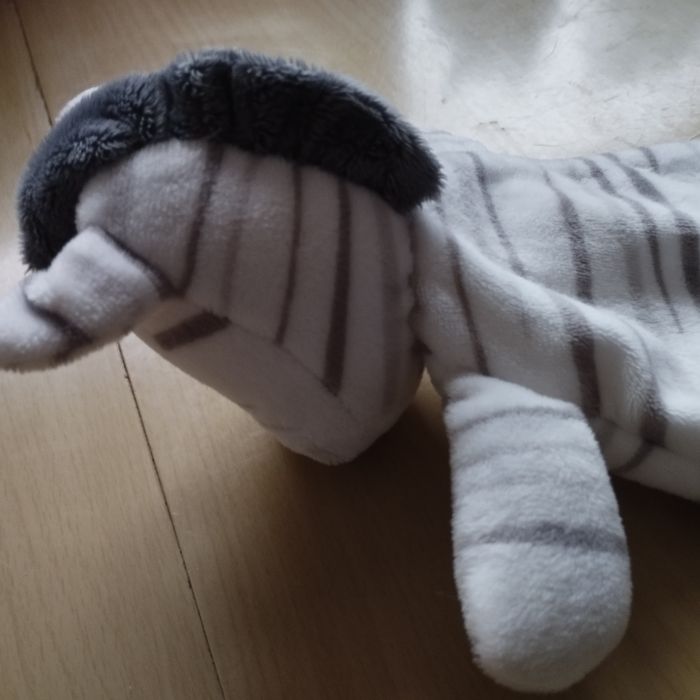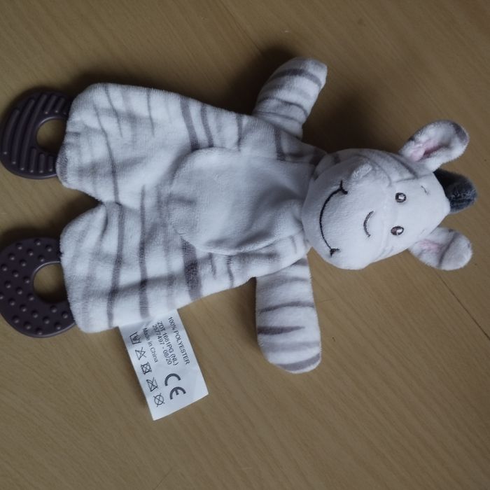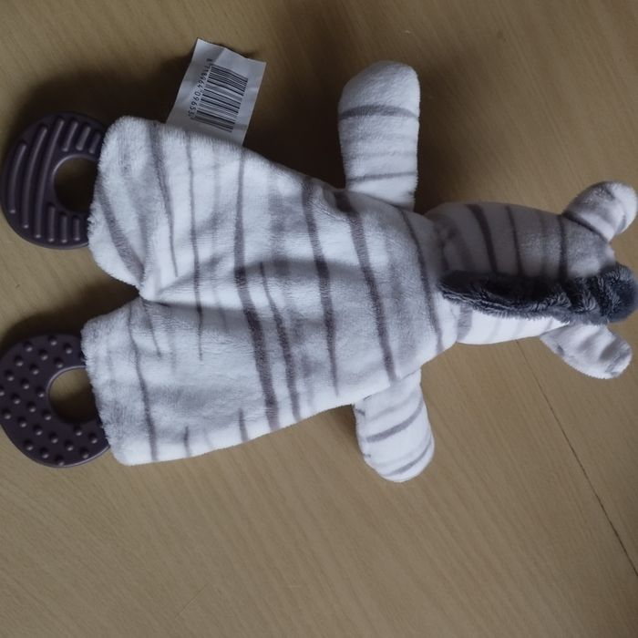 Doudou Semi Plat Zèbre avec 2 anneaux de dentitions, et papier bruissant sur tout le corps. Jamais servi.