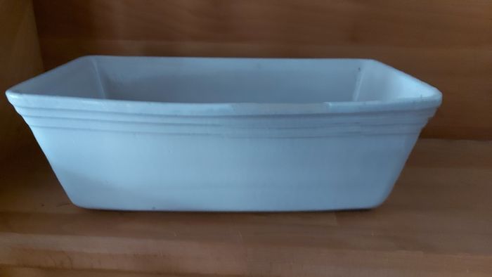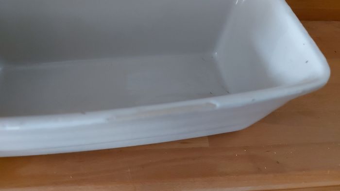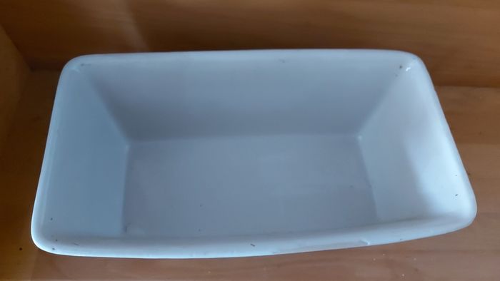 Plat blanc en terre cuite avec motif en relief sur les petits côtés. Neuf mais présente des défauts de fabrication et liés à l'entreposage. L 28,5 x l 16,5 x ht 10 cm