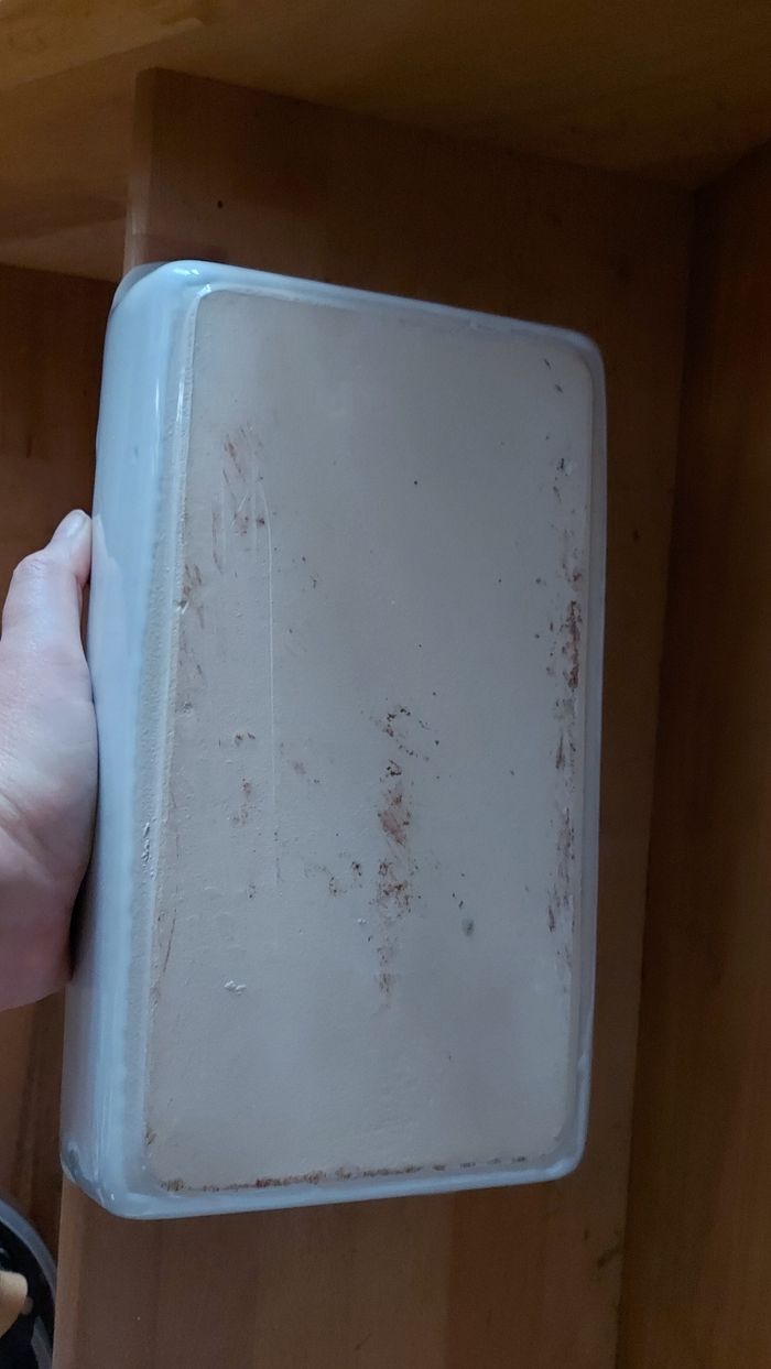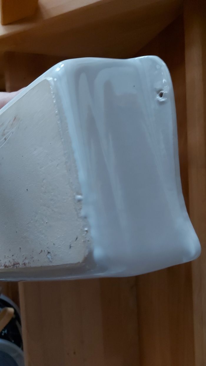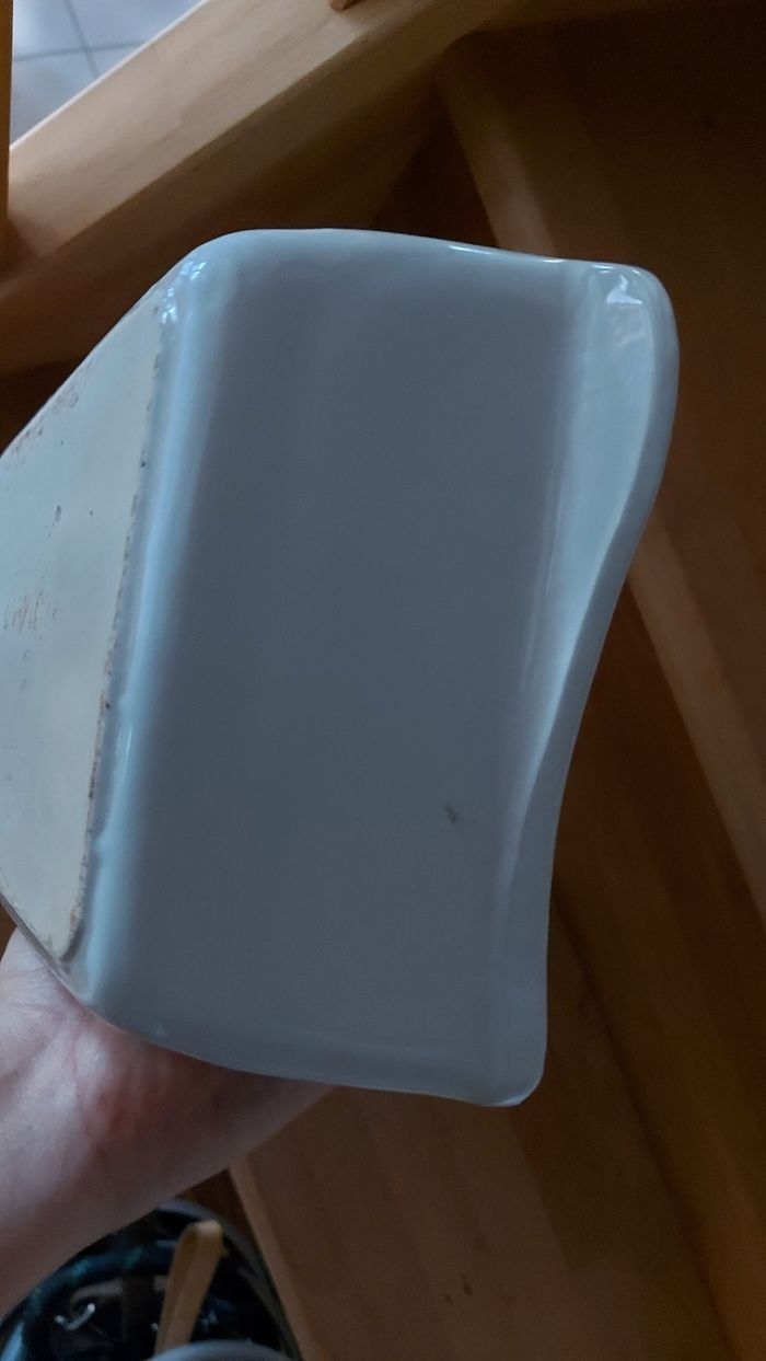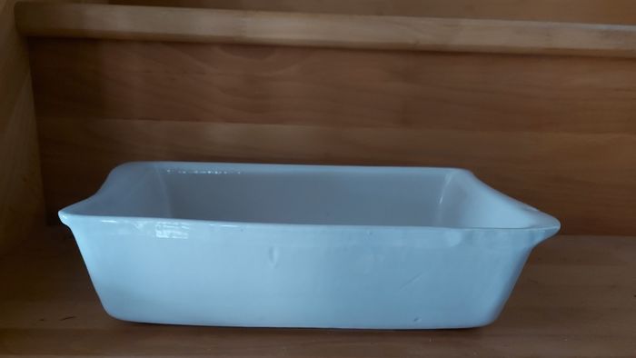 Plat blanc en terre cuite. Neuf mais présente des défauts de fabrication et liés à l'entreposage. L 30,5 x l 16,5 x ht 8 cm