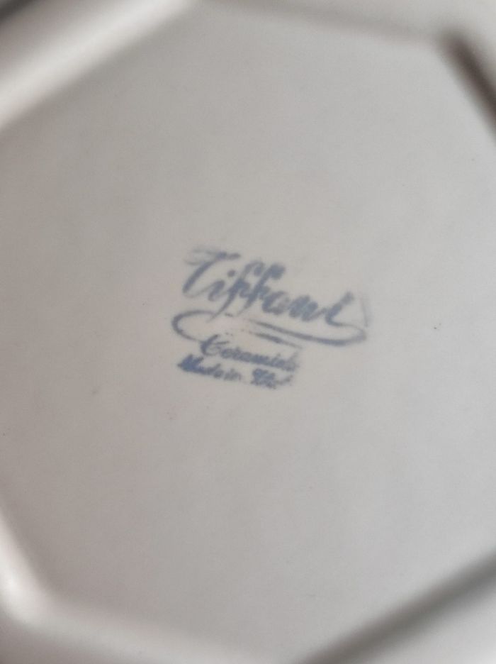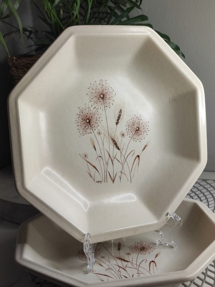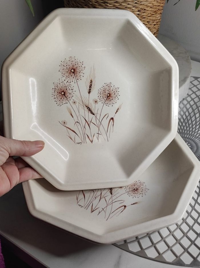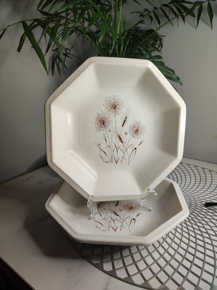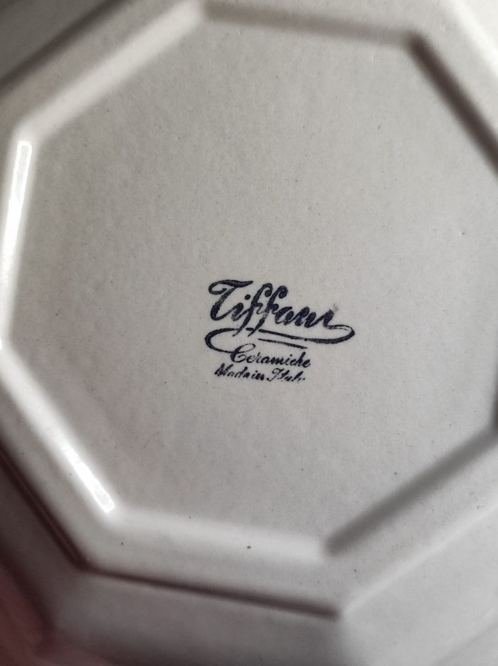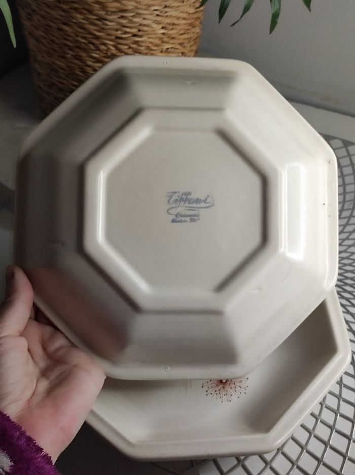 2 assiettes creuses de forme octogonale en céramique de tiffani. Quelques petits éclats sur le côté sur une assiette, pas d'ébruchures ou fissures, anciennes assiettes de famille. 21,5cm de diamètre