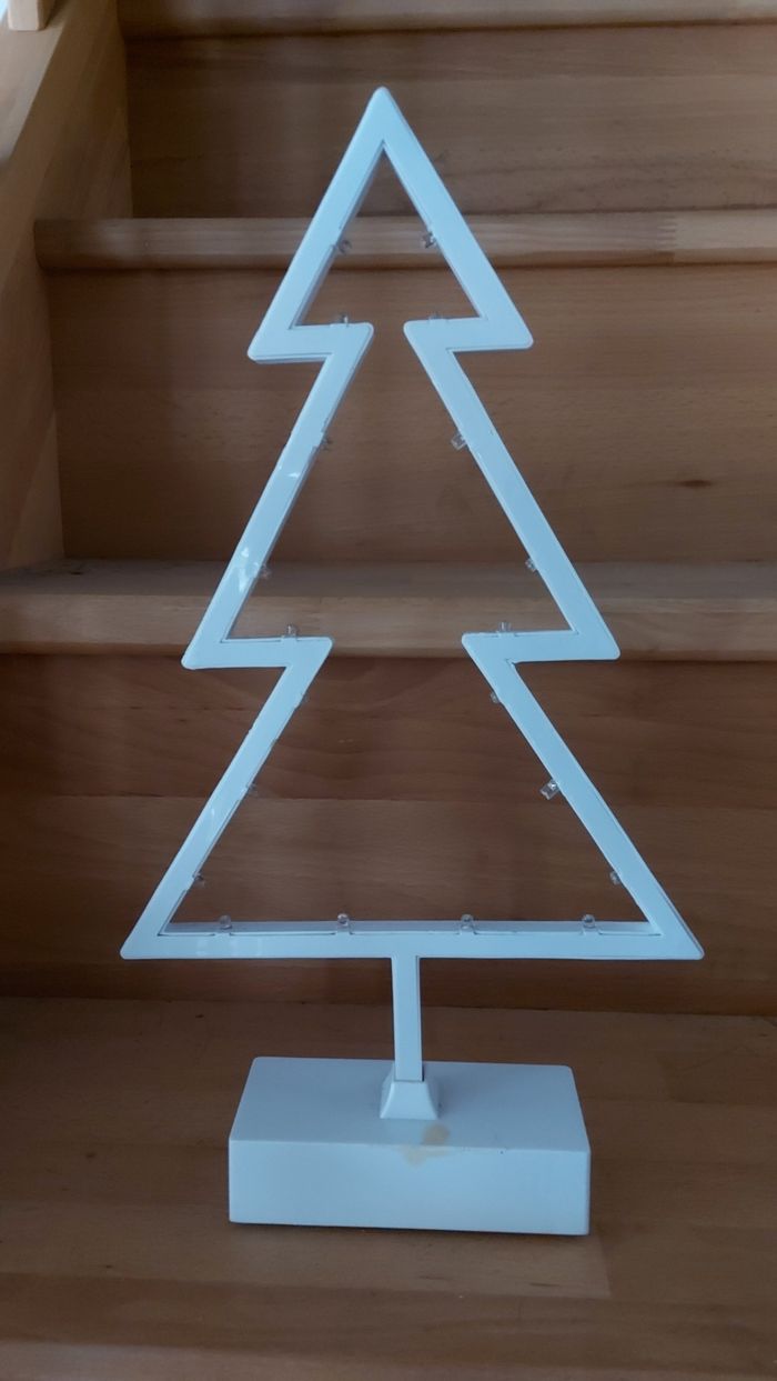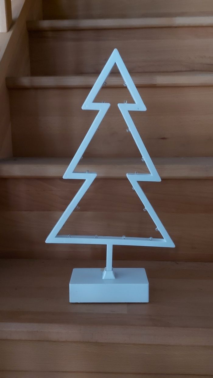 Sapin blanc en plastique, lumineux, ht 40 cm Socle taché et abîmé Fonctionne sur piles non fournies