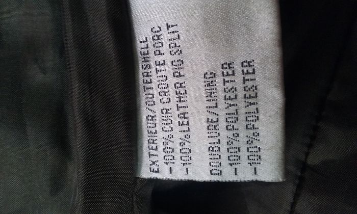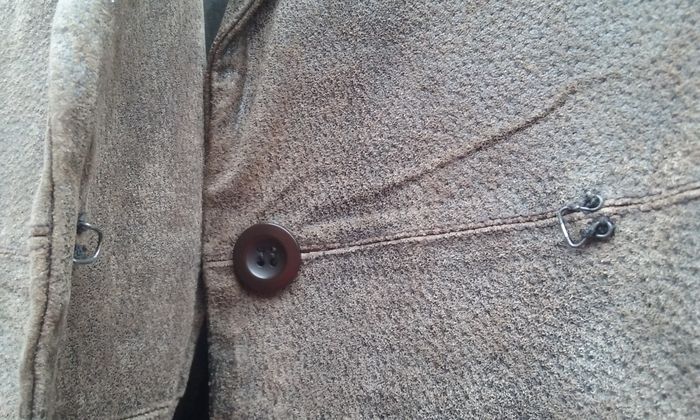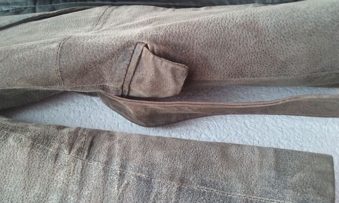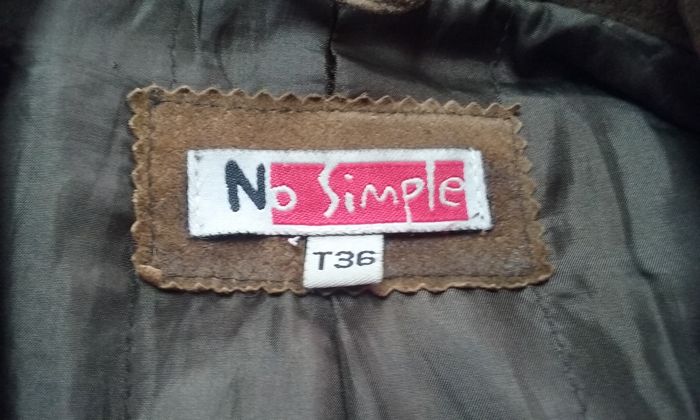 Veste 100% cuir aspect vieilli, doublure, fermeture par un bouton et une agrafe, ceinture, 2 poches. Il manque un bouton au niveau d'une manche (2 au lieu de 3)!