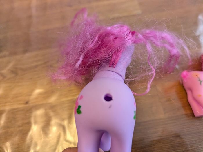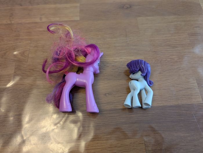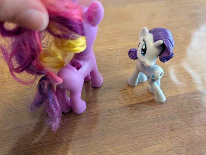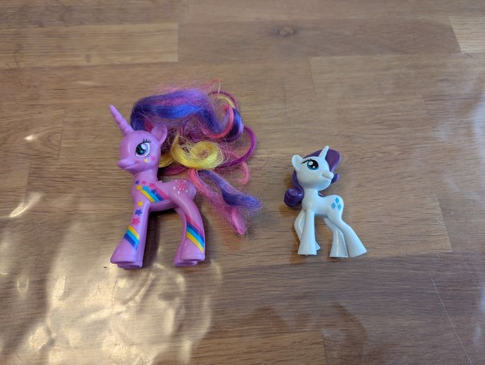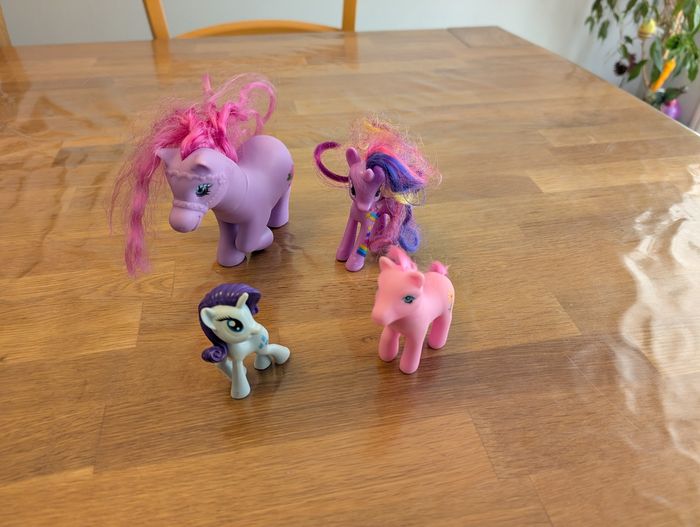 Lot de 4 jouets poney État satisfaisant, il manque des crinières, des ailes, des traces peuvent être présentes Il y en a deux de la marque My little Pony