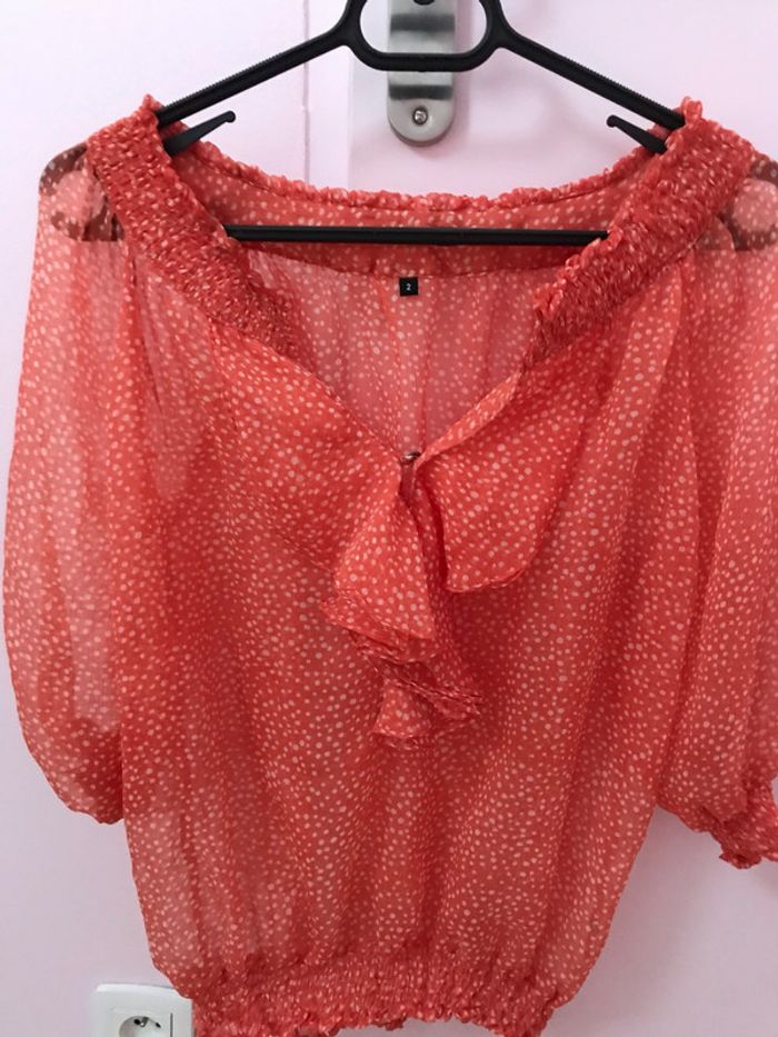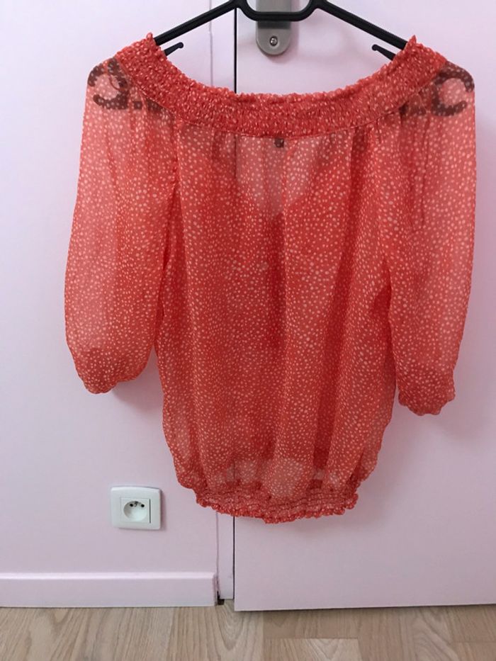 Blouse fluide transparente corail T2 Pois blanc Élastique taille, manches 3/4 Encolure aux épaules