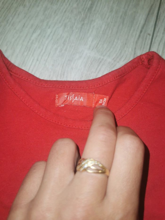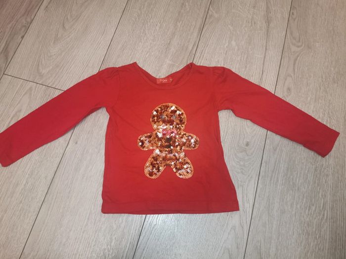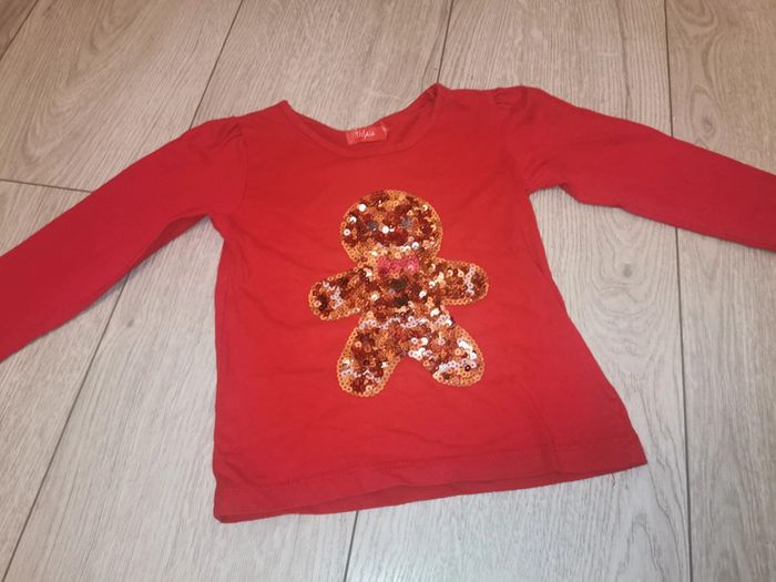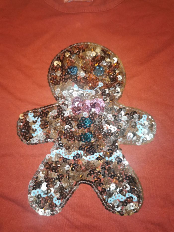 Pull rouge à manches longues et col rond. Décor à sequins sur le thème de petit biscuit, brillants. Marque Tissaia, taille 3 ans. Parfait état, peu porté. Haut mixte.