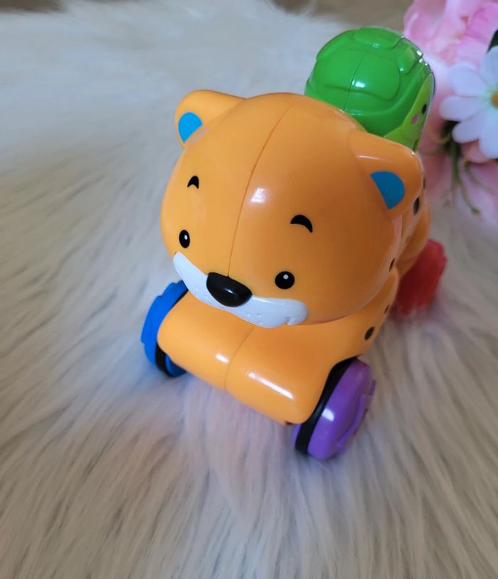 Très bon état, En appuyant sur la sympathique tortue qui monte sur le dos du léopard, bébé sera ravi du mouvement de la queue qui se balance lorsque le léopard roule sur le sol. Les deux animaux sont parfaits pour jouer à la maison ou en déplacement !