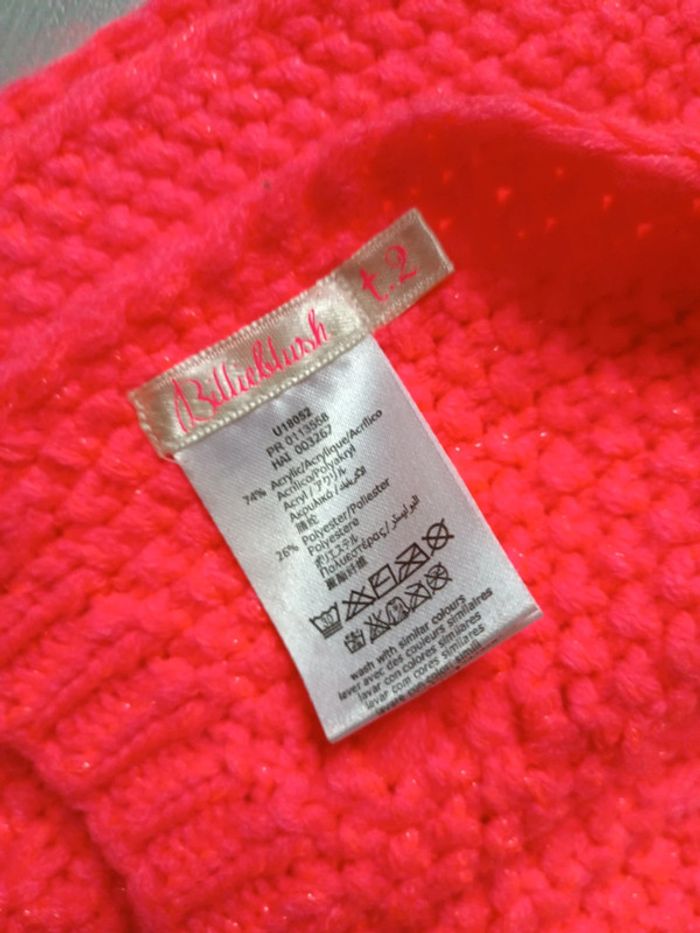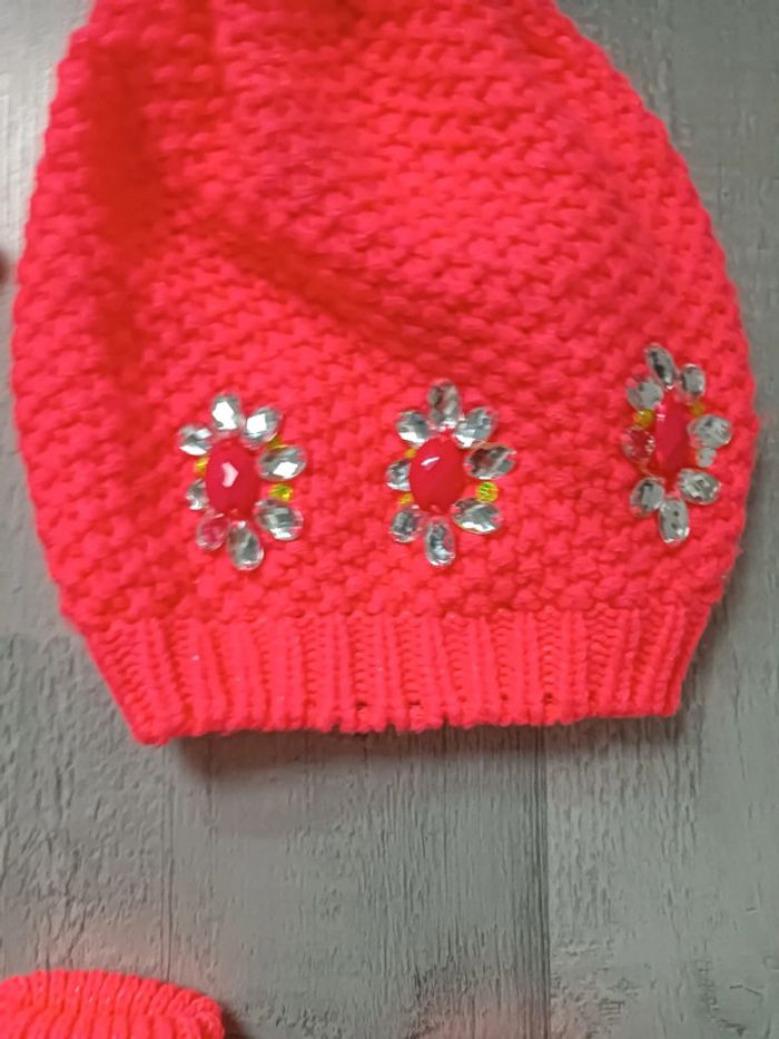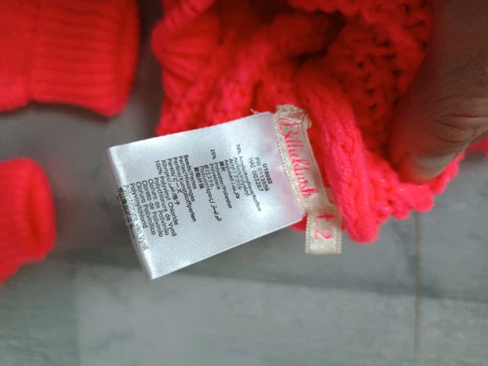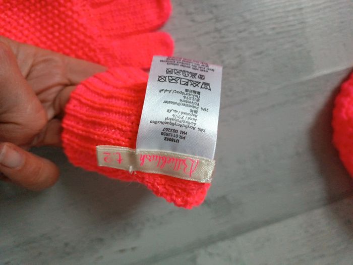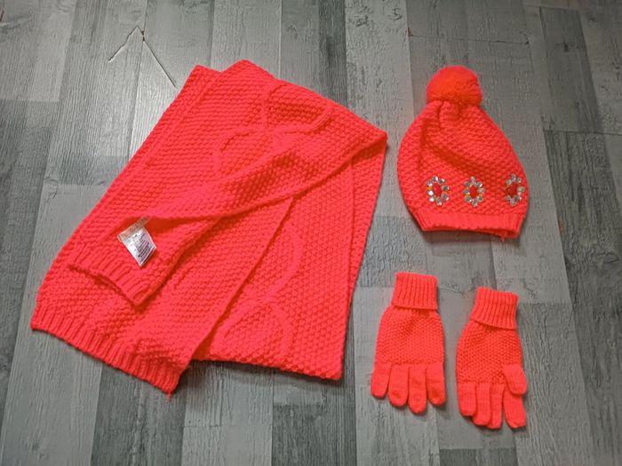 Ensemble Billieblush composé d'un bonnet,d'une écharpe et d'une paire de gants taille 2 correspond à du 52/54 porté une fois à peine 1h sauf les gants jamais utilisés, couleur rose fluo acheté 79 euros