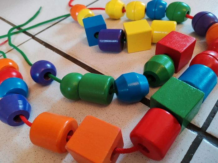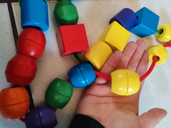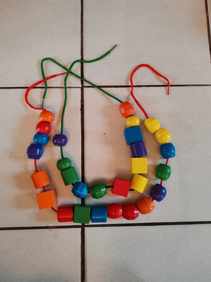 Lot de 29 grosses perles en bois avec 2 cordons Idéal pour la motricité et manipulation, rythmes formes et couleurs.. Très bon état ➡️ #ursullabuffayjeuxenbois