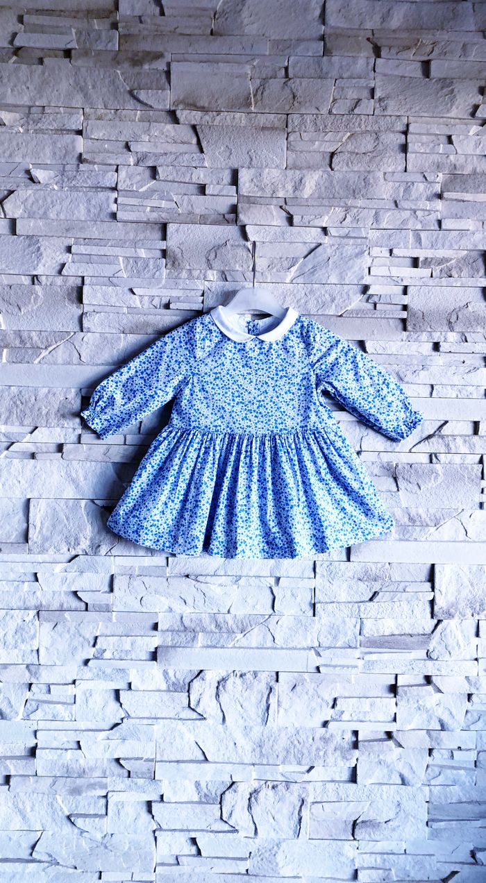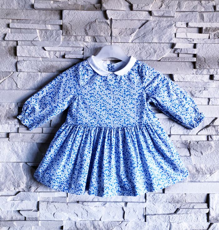JACADI - ROBE BÉBÉ FILLE IMPRIMÉ LIBERTY TONS BLEUS & VOLANTS AUX POIGNETS 12M - photo numéro 1