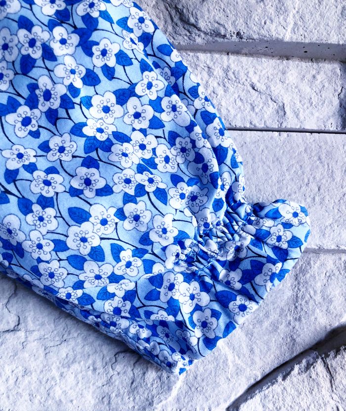 JACADI - ROBE BÉBÉ FILLE IMPRIMÉ LIBERTY TONS BLEUS & VOLANTS AUX POIGNETS 12M