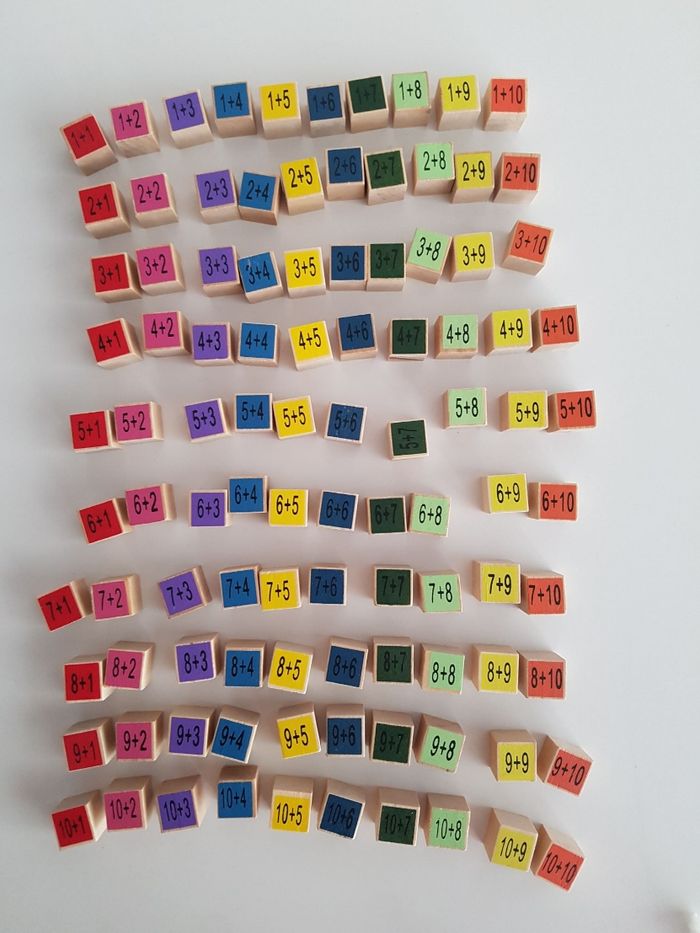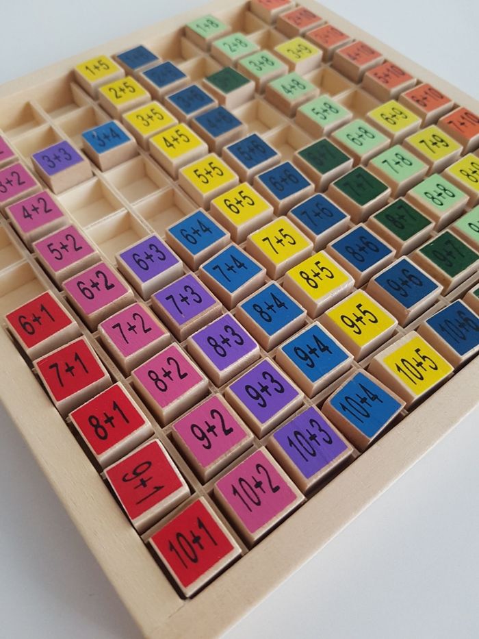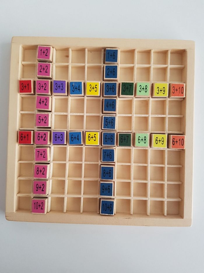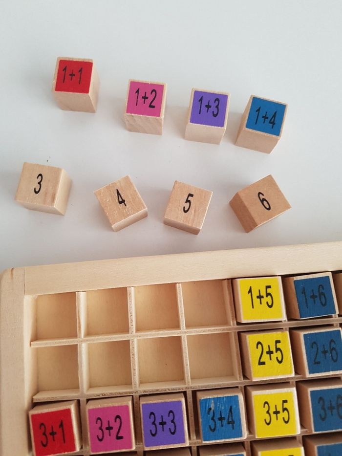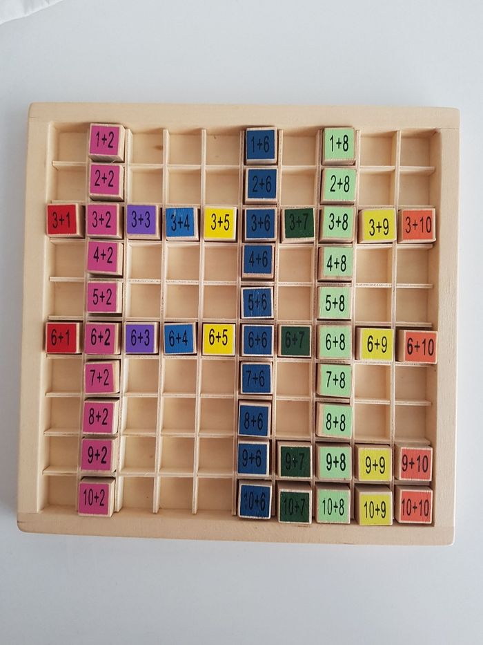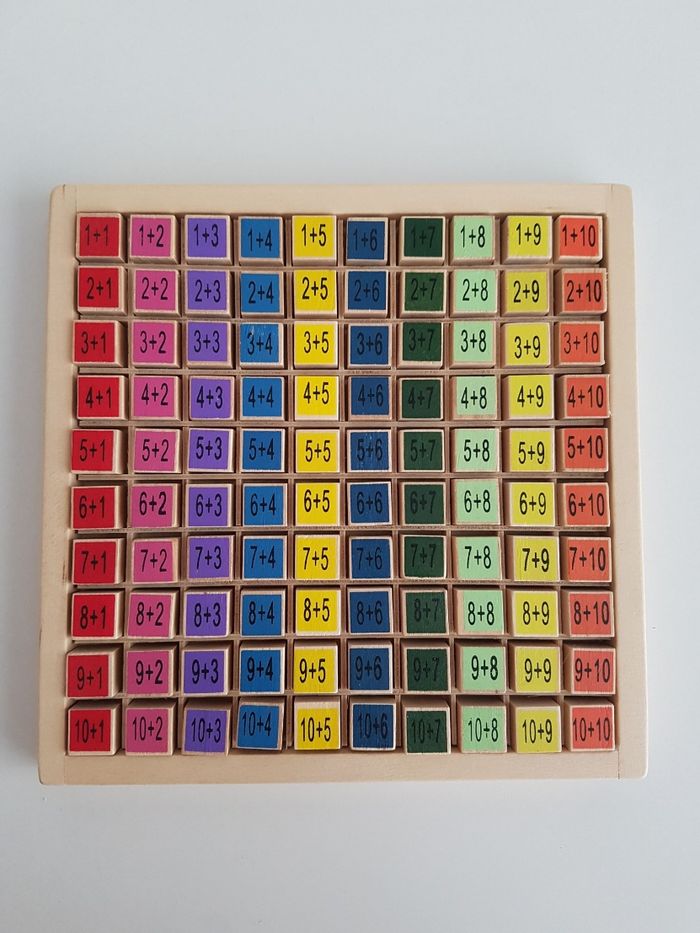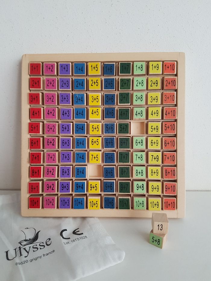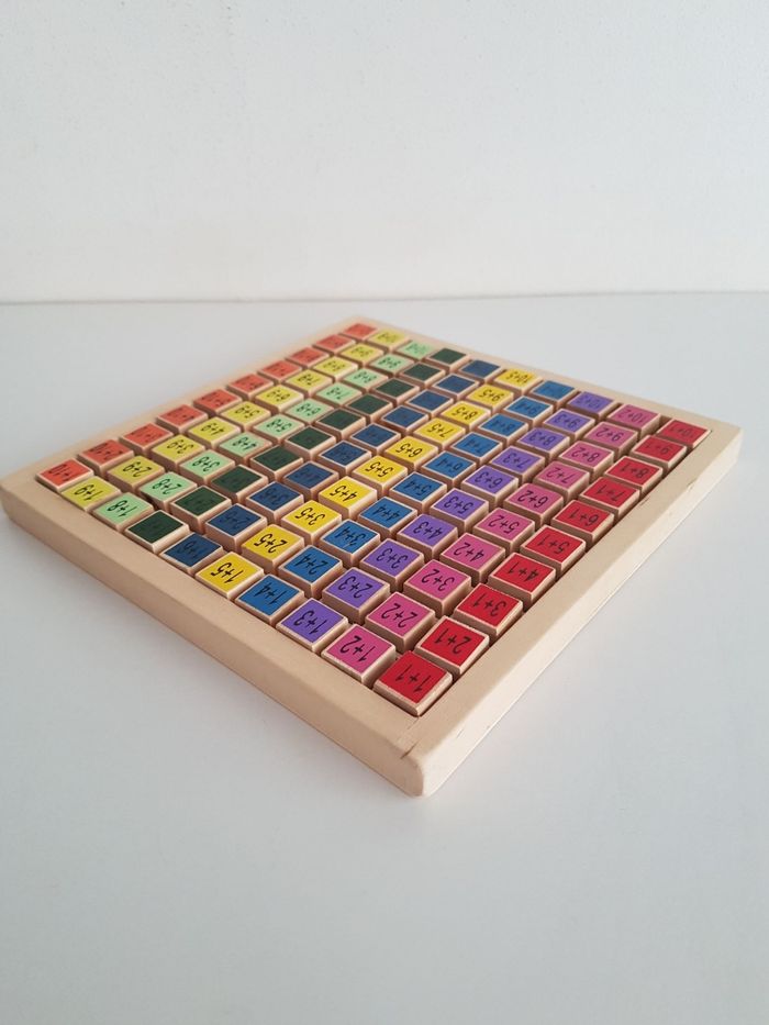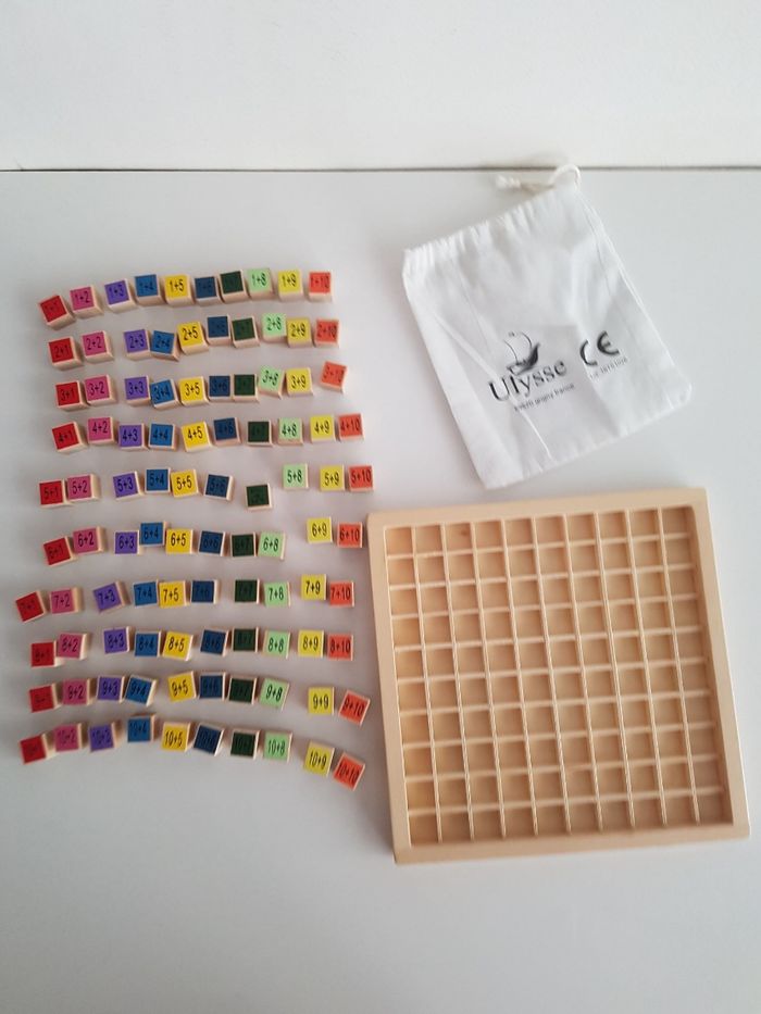 Jeu éducatif en bois avec une planche de 100 cases et 100 dés colorés où figurent l'opération et sa solution Outil pédagogique montessori en bois pour découvrir les mathématiques et s'amuser avec les nombres pour mémoriser de manière ludique les tables d'addition Manipuler et refaire les tables comme un puzzle permet un apprentissage du calcul plus visuel et plus adapté, et de s’exercer seul en découvrant les solutions. Jeu éducatif multi-activités : _ Apprendre les tables de chaque unité. Il faut retirer les blocs de façon à ne laisser que les colonnes ou lignes de 2, 5, 10 ... _ Mémoriser les tables d'addition _ Réaliser des puzzles avec les cubes de couleurs selon son imagination, s'amuser avec la géométrie _ S'amuser avec les couleurs de l'arc-en ciel COMPLET : 1 support, 100 cubes et 1 sac de rangement Dimensions du plateau : 20 × 20 cm