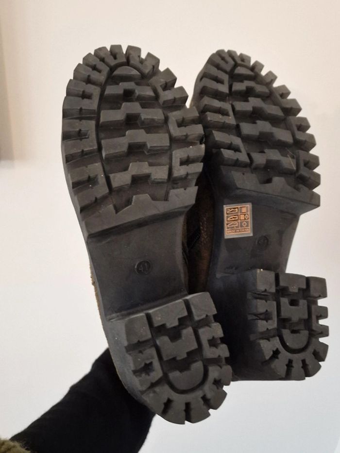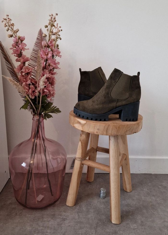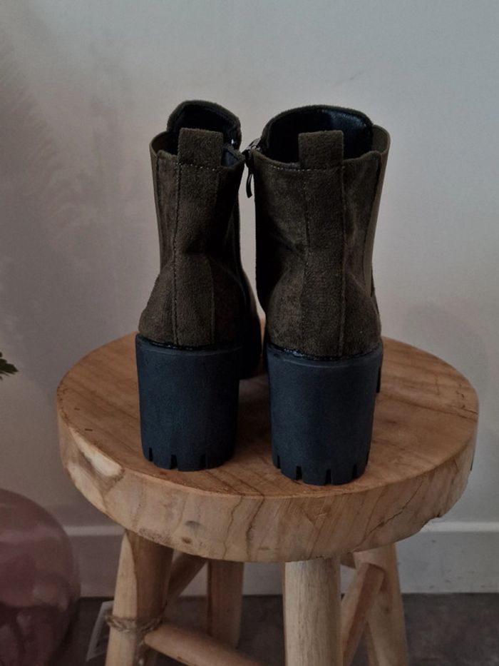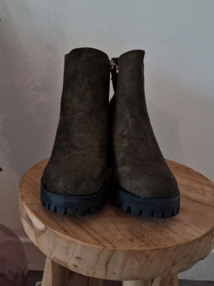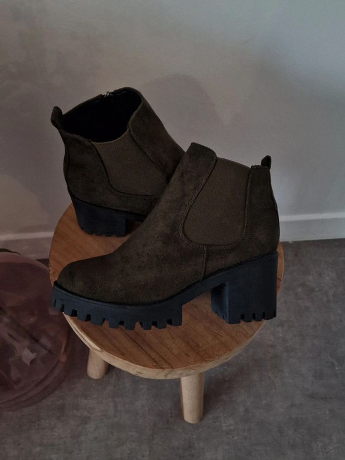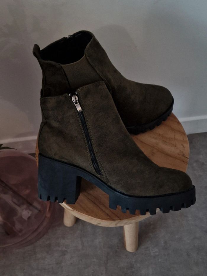 Jolie paire de botinnes kaki Fermeture zip, jamais portées Talon 7 cm , style daim