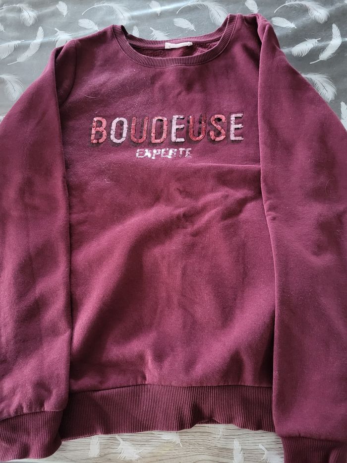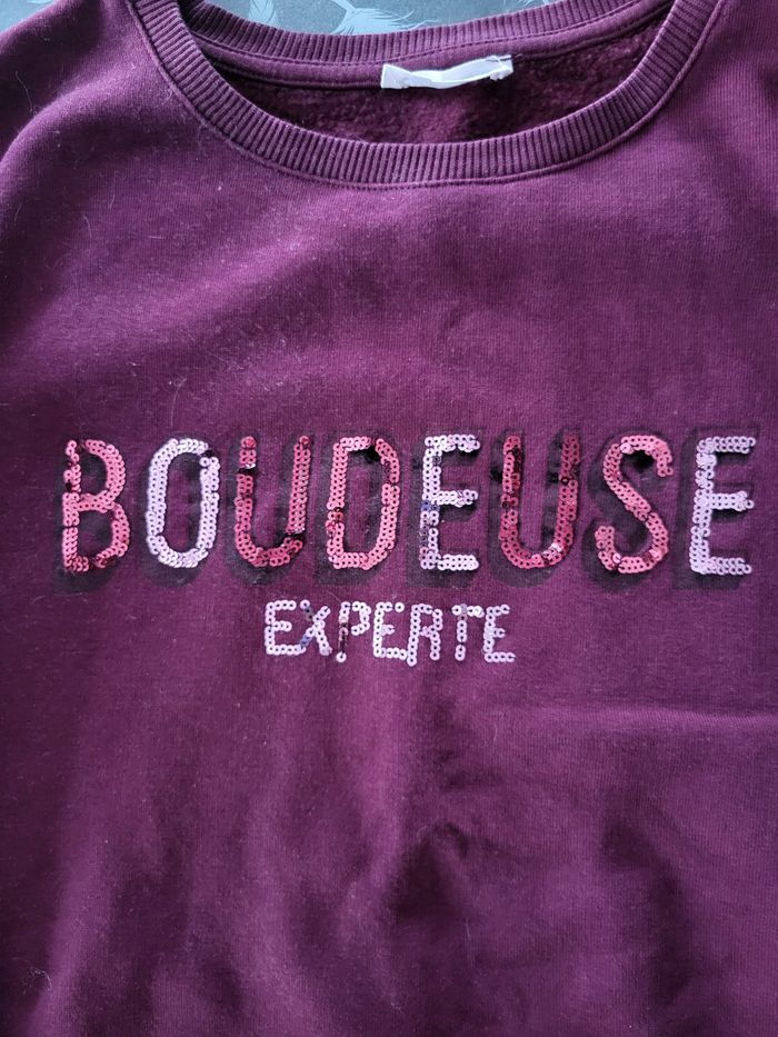 Avec inscription en sequins "boudeuse experte". Intérieur en molleton. En bon état sans trous ni tâches.