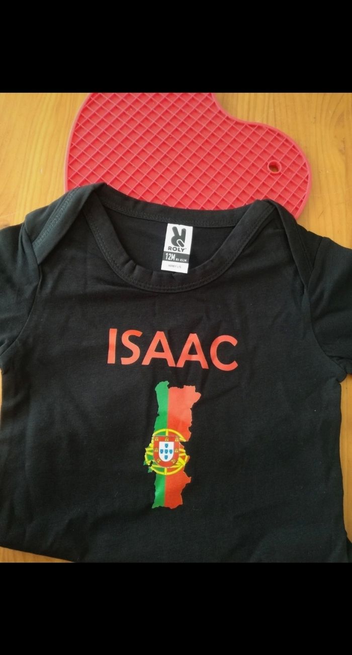 Je vends un joli body à manches longues de la marque Roly. Taille indiquée : 12 mois 80-85 cm Dimensions : 41 x 24 cm Coloris noir Imprimé Isaac + Portugal Je l'ai fait faire pour Noël sur le site Yonacrea mais je me suis trompée de taille (le bébé mettait en fait du 24 mois 😢). Je l'ai payé presque 20 euros (frais d'envoi inclus). Il est neuf.