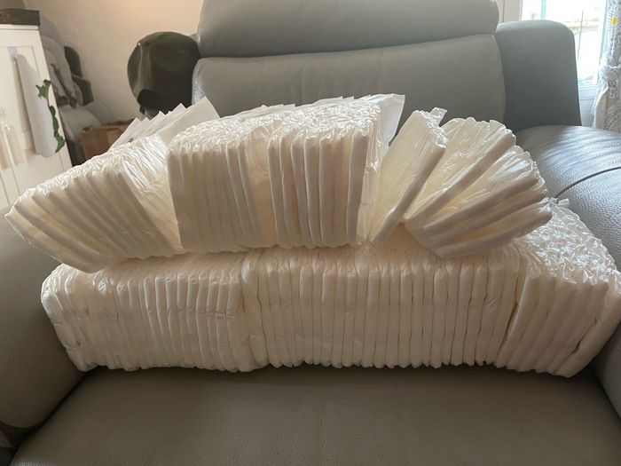 Lot de 77 couches Mots d’enfant taille 6. Juste sorties de leur emballage pour rangement, toute neuves. Mon fils est devenu propre à 100%. Envoi rapide le jour même où le lendemain. Merci