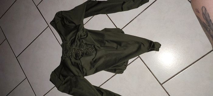 Body kaki effet satiné décollé plongeant avec petit anneaux doré