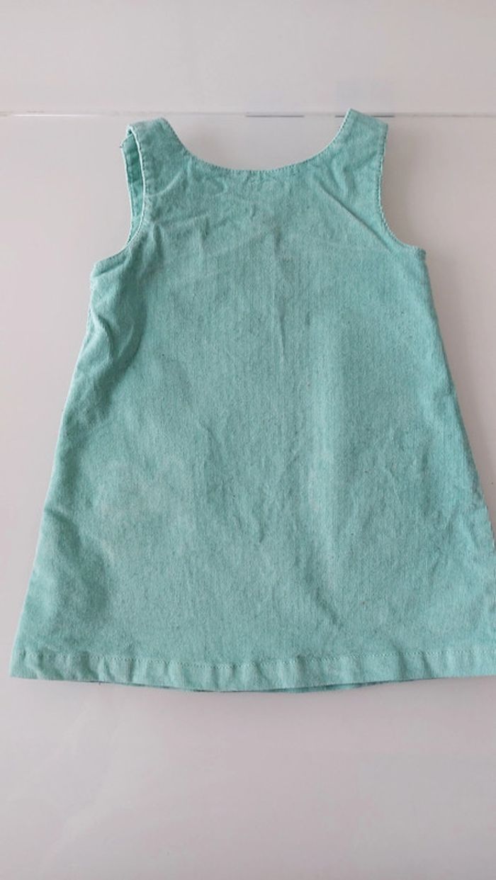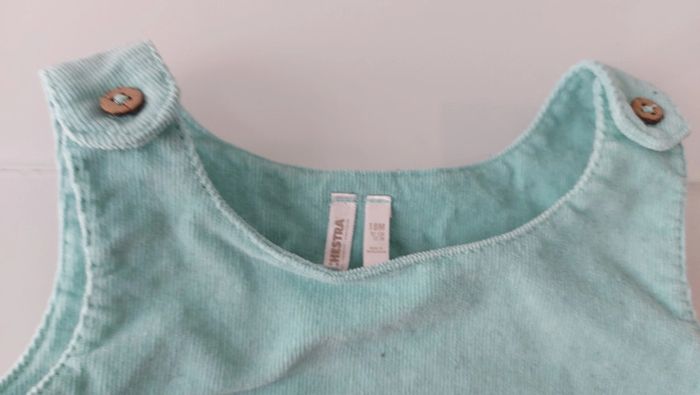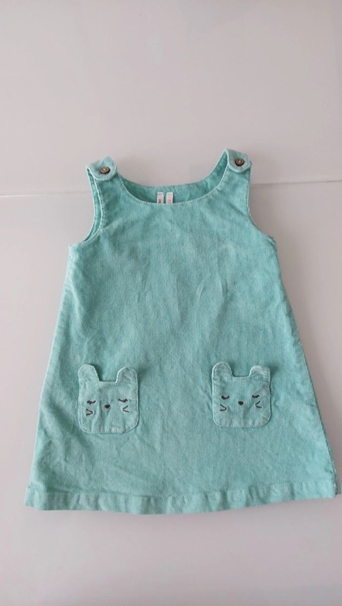 Ensemble composé d'une robe à bretelles en velour côtelé vert d'eau et d'un Tee-shirt manches longues à motifs pastels. Taille : 18 mois. Orchestra. Jamais porté.