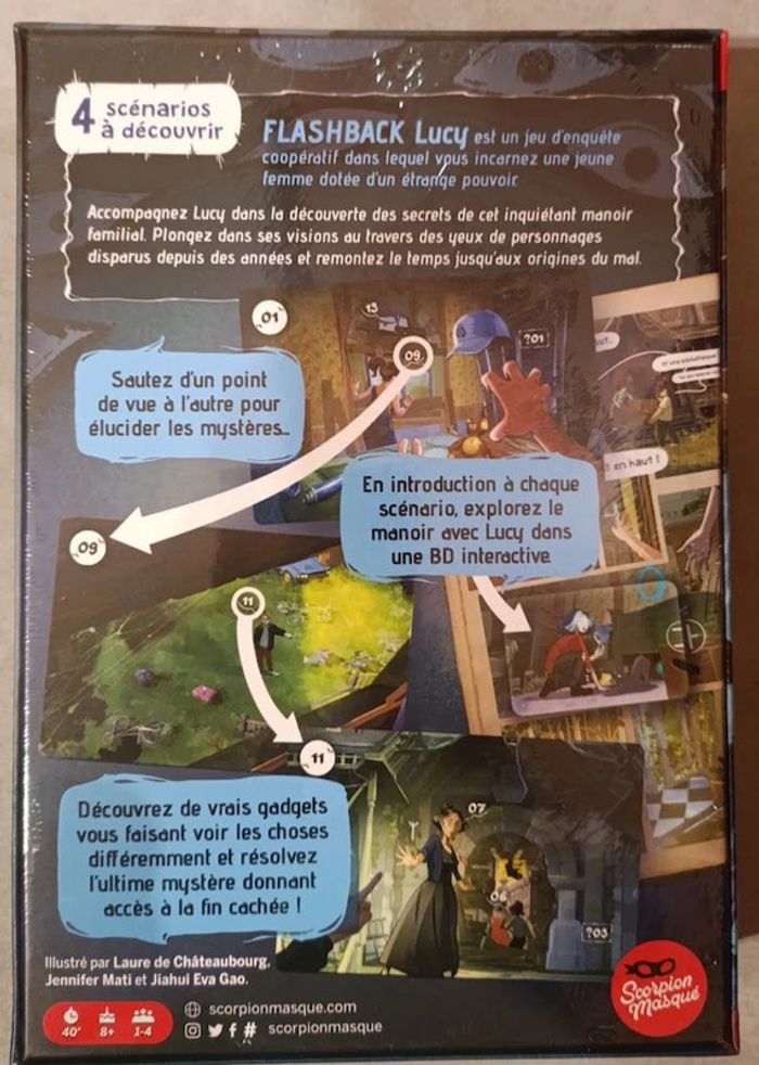 Ludipresta : Vente professionnelle - Jeu de société sous emballage - Prix Ferme Français à partir de 8 ans moins de 30mn 1 à 4 joueur(s) ♥ coup de coeur ♥ points forts : - Narration Immersive - Mécanique de Jeu Innovante - Aspect Coopératif Flashback est de retour dans un univers effrayant qui vous collera la frousse Dans Flashback : Lucy, vous incarnez une jeune fille au pouvoir étrange qui hérite d’un mystérieux manoir dans lequel de sombres évènements se sont passés. Explorez ce lieu inquiétant et apprenez-en plus sur Lucy, son pouvoir, sa famille et son rôle dans cette grande histoire. Avec la mécanique de Flashback, voyagez dans le passé grâce aux visions de Lucy et partez à la rencontre de l’ombre qui hante le manoir. Mettez-vous à la place des personnages et découvrez leurs points de vue, accumulez les indices, élucidez les mystères, et répondez aux questions qui vous sont posées. À la différence de Flashback : Zombie Kidz, c’est d’époque en époque que vous allez voyager, en découvrant le manoir à différents moments dans le temps. Avant et après chacune des visions de Lucy, explorez le manoir avec son chat, Gredin, dans une bande dessinée interactive. Et bien sûr, découvrez des gadgets encore plus originaux et immersifs ! Vidéo : https://www.youtube.com/watch?v=zealGNqdUQQ