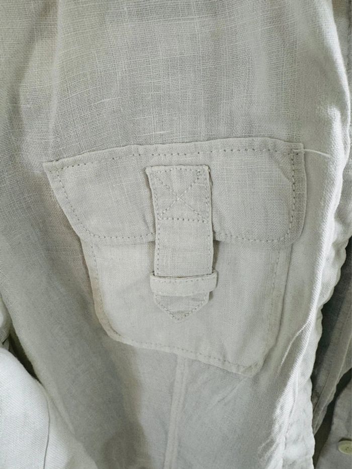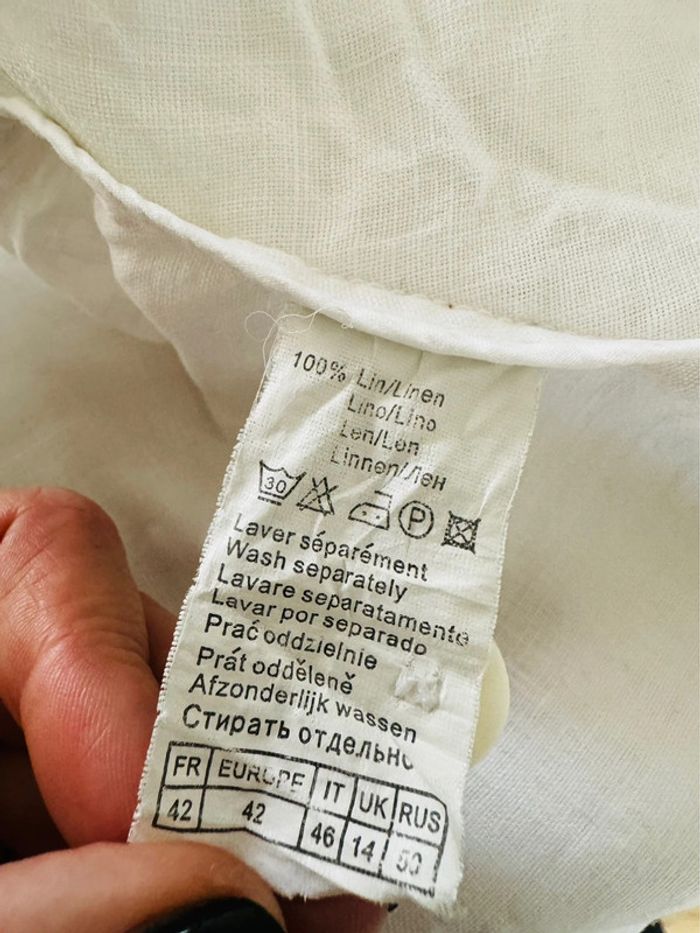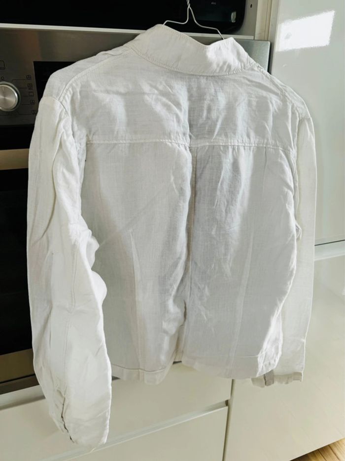 Superbe veste en lin blanche T42 coupe droite. Très bon état.com Mao. Boutons pression au col et aux manches. Boutons normaux sur le devant ( encore le bouton de rechange sur l’étiquette) 100% Lin Excellent état