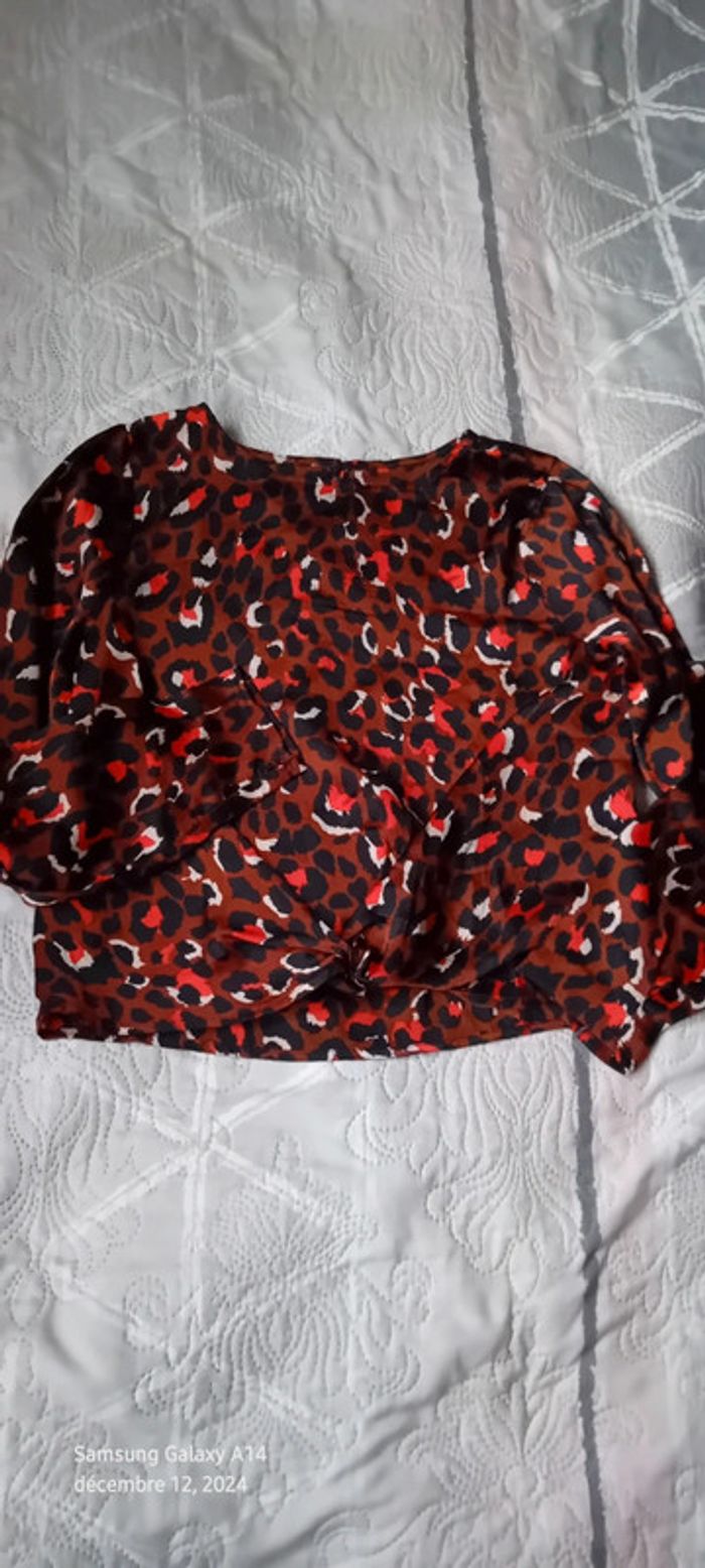 Haut court noeud noué devant en polyester matière légère fluide et satinée motif léopard tons fauves marron cuivré orange noir et blanc col rond fermeture goutte d'eau avec petit bouton au dos longueur 48 cm largeur aisselles à aisselles 47 cm largeur épaules 34 cm longueur manches 58 cm très élégant idéal pour une soirée très peu porté en très bon état #midole #midolefemme38 #midolefemmeM #hautfemme38 #hautmotifleopard #motifleopard #hautsatine #hautavecnoeudnoué #hautcourt #femme38