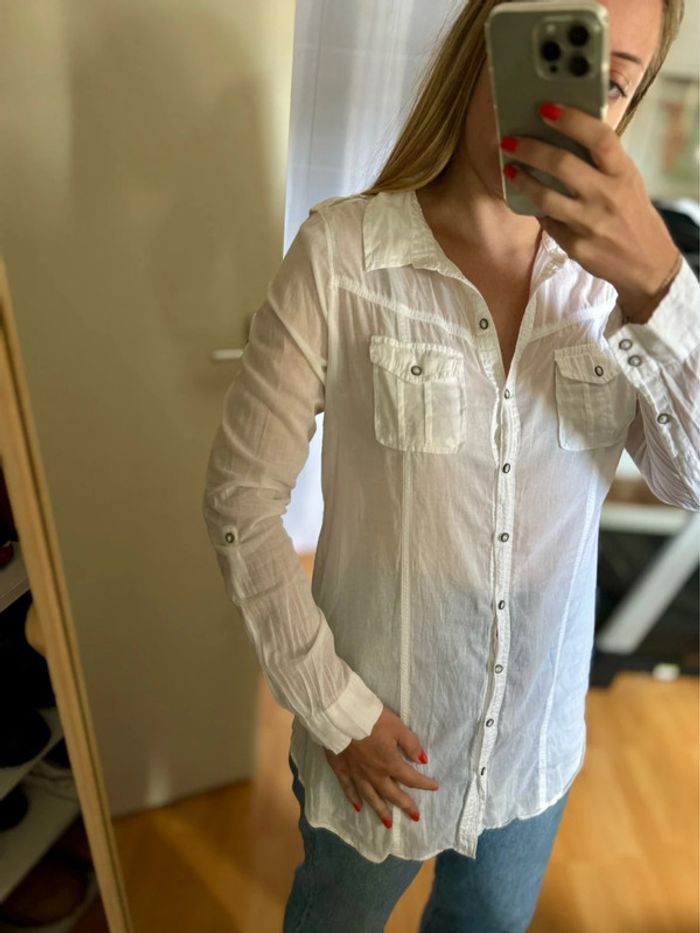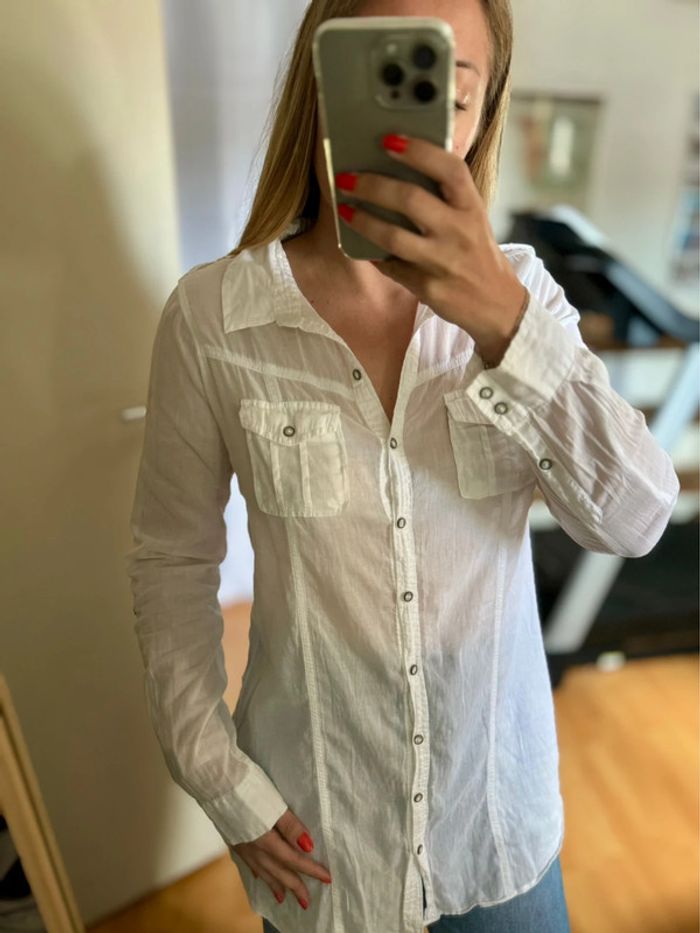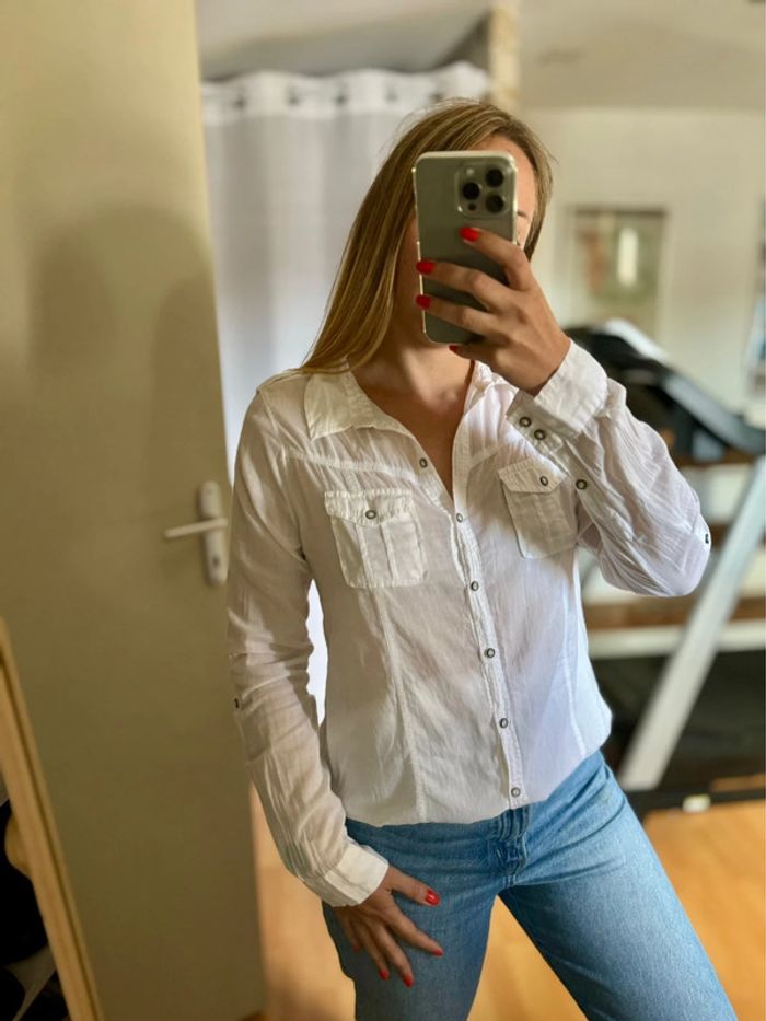 ✨ Chemisier blanc à manches longues Sud Express Taille M 38 Boutonné sur le devant Assez long, peut être porté de façon classique (entré ou sorti du pantalon) ou ouverte, version plage, etc Étiquette composition coupée mais il me semble que c’est du coton #sudexpress #sudexpress38 #chemisier #chemisefemme #chemise #chemisecoton #ete #chemisefluide #haut #hautsudexpress38 #boouse #jasou38 #jasou_haut