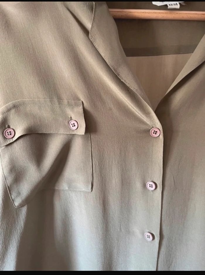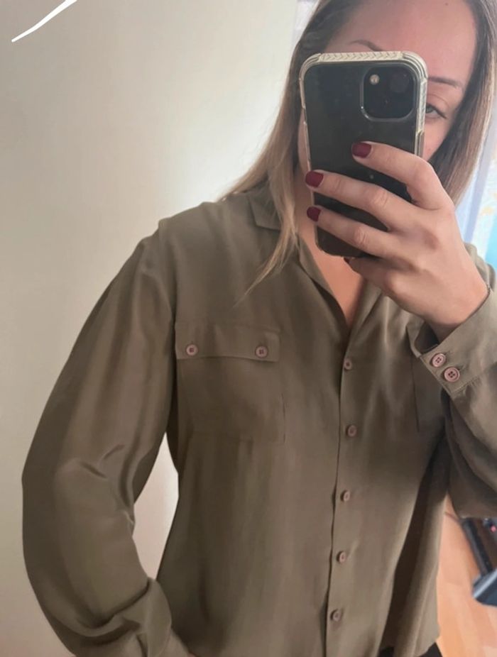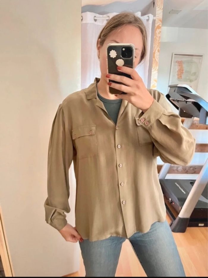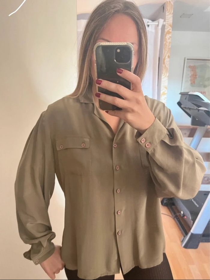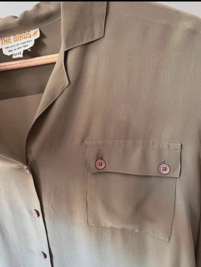 ✨ Tres belle blouse vintage en soie kaki « The Birds » Pour moi la taille est adapté à un 38, mais vous pouvez aussi la porter sur un 36 plus loose ou un 40 plus près du corps. Étiquettes visibles en photos. Quelques mini « traces » sur le tissu visible uniquement à la lumière (2 dernières photos) #thebirds #vintage #blousevintage #blousevintage38 #haut #hautmancheslongues #blousesoie #blousesoie38