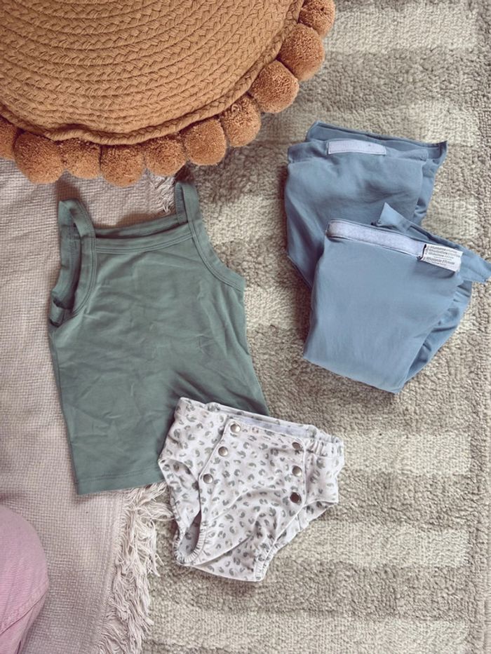 Peu porté en très bon état Culotte taille L, valeur : 39€ Lot de 2 cachettes lavables taille 2, valeur : 26€ Débardeur taille 12/18 porté une fois, valeur : 22€ Soit la valeur du lot : 87€