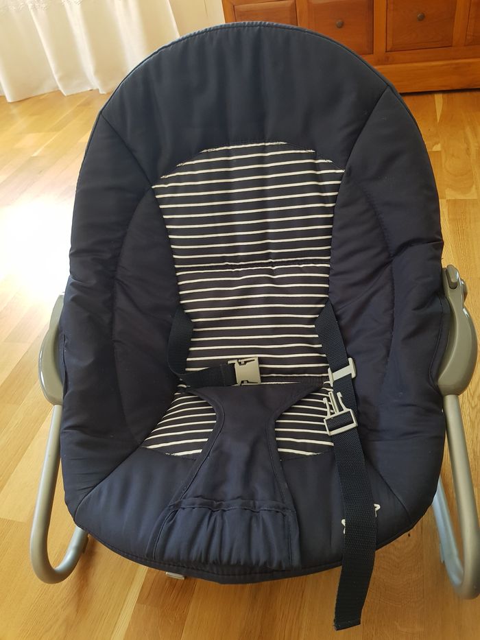 Comme neuf Idéal de la naissance jusqu'à 9 kg Utilisable en position fixe ou balancelle Housse molletonnée amovible Ouvert : 71x48x57 cm Plié : 71x57x14 Structure métal Poids : 2kg65