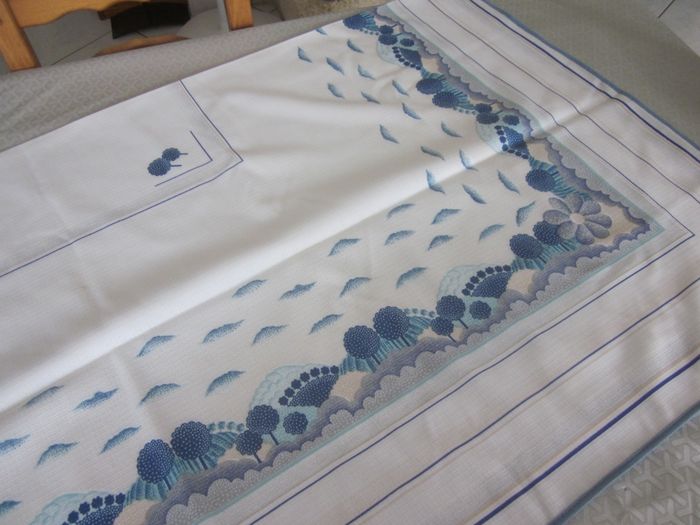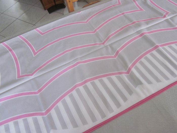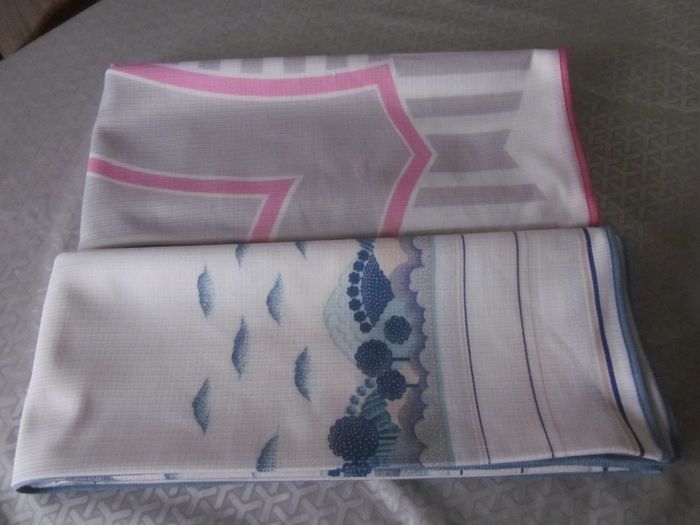 2 nappes rectangulaires, une 180 x 150 cm (rose/gris/blanc) + une 187 x 150 cm (crème/bleu), BEG pour les 2