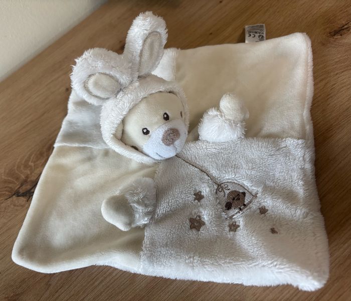 Doudou plat ours déguisé en lapin blanc crème oiseau gemo - photo numéro 1