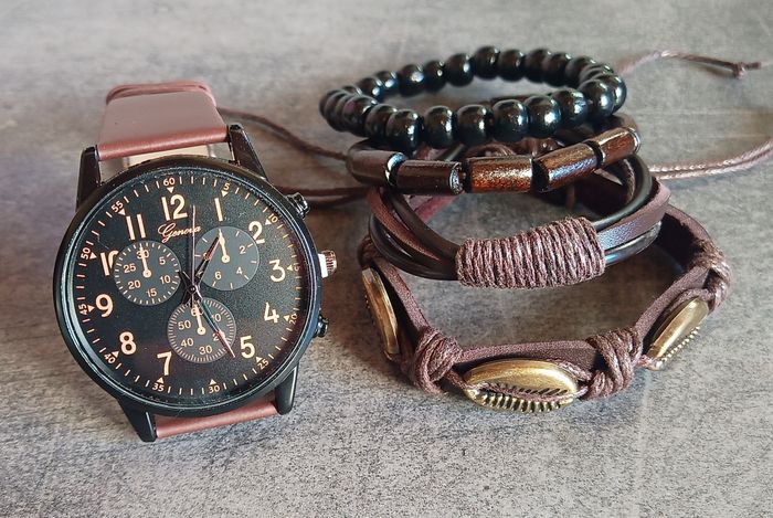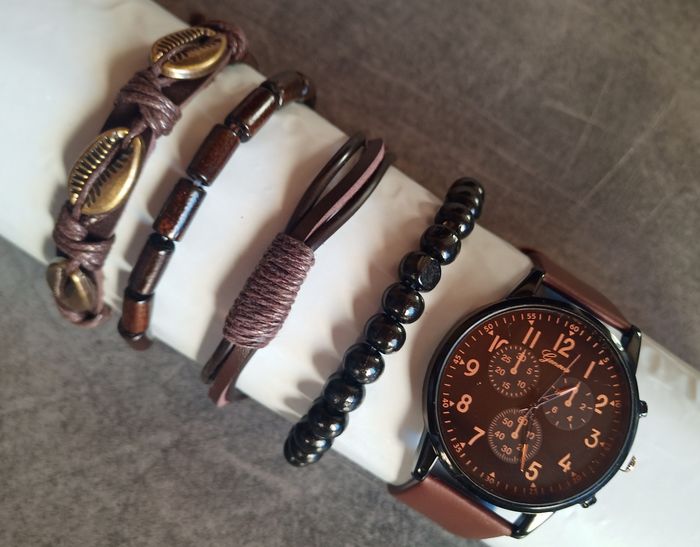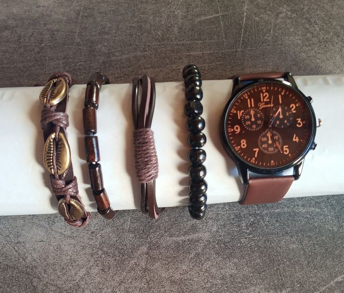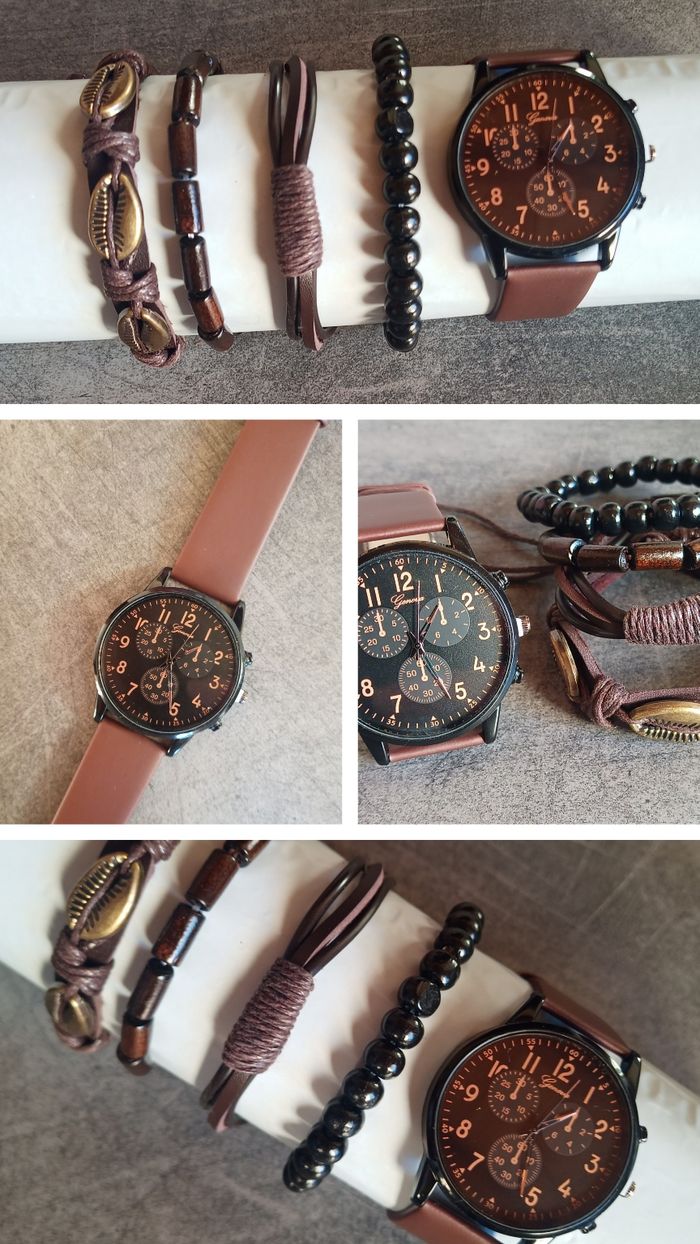 Idées cadeaux de Noël ❤️ Ensemble Montre et bracelets Neuf 1 montre + 4 bracelets assorti Prix: 15€ Couleur : Marron Neuf et emballé ! Disponible immédiatement Envoie rapide et soigné Profitez de remise sur l'achat d'un lot 🖤